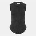 This Off White top features a striking marble pattern, offering a unique aesthetic. Designed with a crew neck and sleeveless style, it provides a modern and sleek look. The slim fit ensures a flattering silhouette, making it a versatile addition to any wardrobe. -