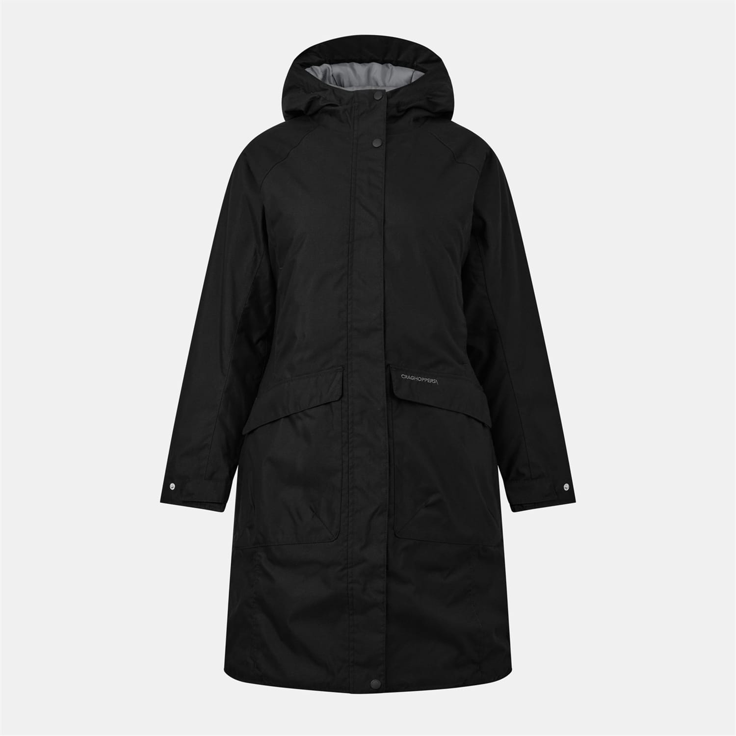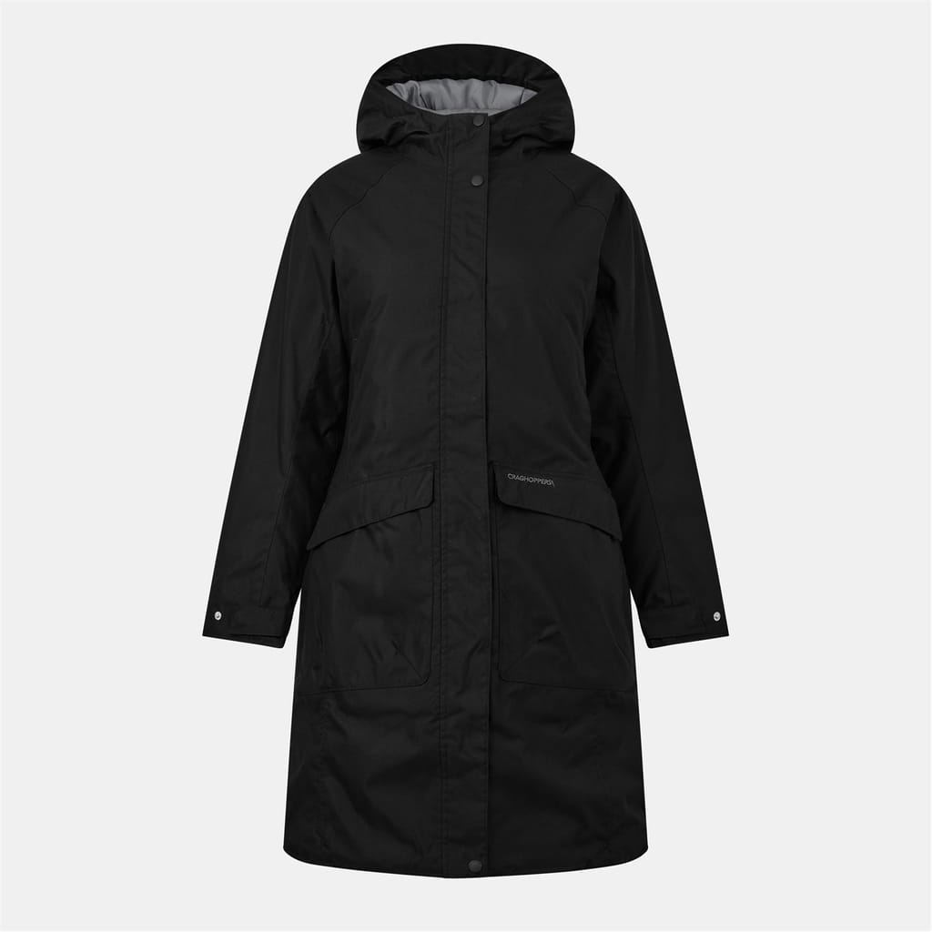 This Craghoppers parka jacket is designed for functionality and style. Featuring a hooded design, it offers water-repellent and insulated properties, ensuring comfort in various weather conditions. The relaxed fit and solid pattern provide a versatile look, while the snap button and zipper closure add practicality. Embellished with a logo and pockets, it combines utility with a sleek appearance. -