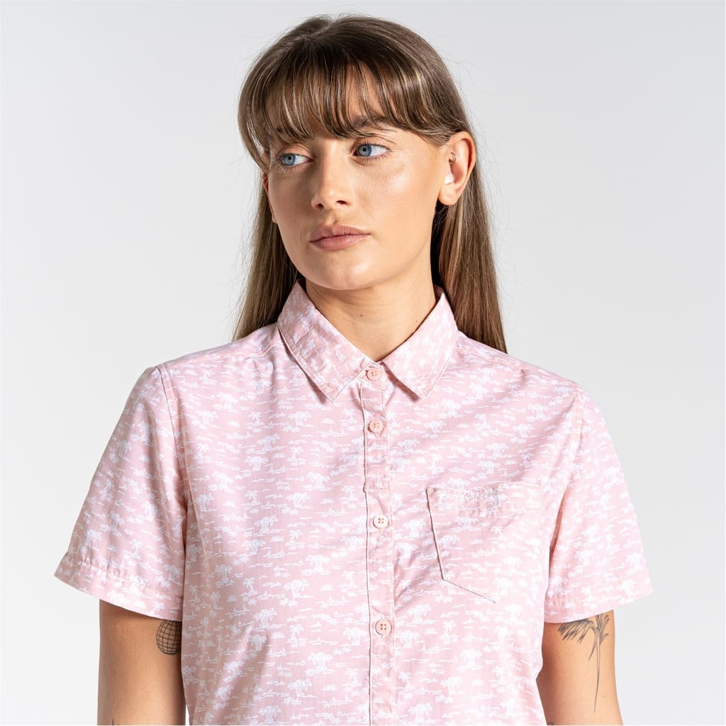 The Craghoppers Tulia top features a floral pattern, offering a stylish touch to your wardrobe. Designed with short sleeves and a regular fit, it ensures comfort and ease of movement. The shirt collar and button-down closure add a classic element, while the chest pocket provides a practical detail. Perfect for casual outings, this top combines functionality with a touch of elegance. -