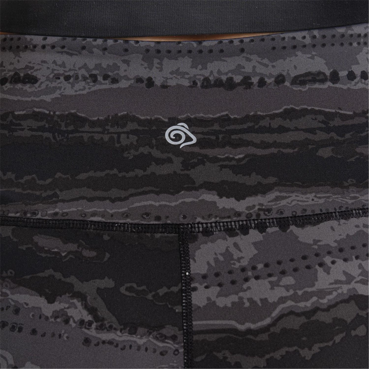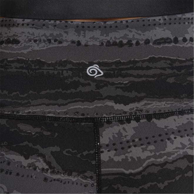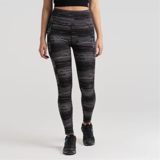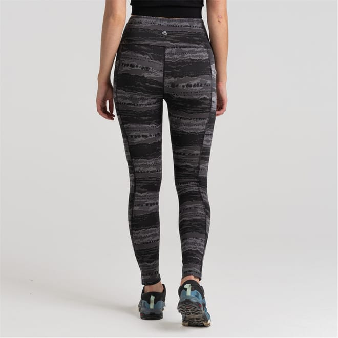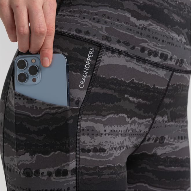 Craghoppers leggings feature an abstract pattern, perfect for activewear collections. These slim-fit leggings are designed with convenient pockets, offering both style and functionality for your active lifestyle. -