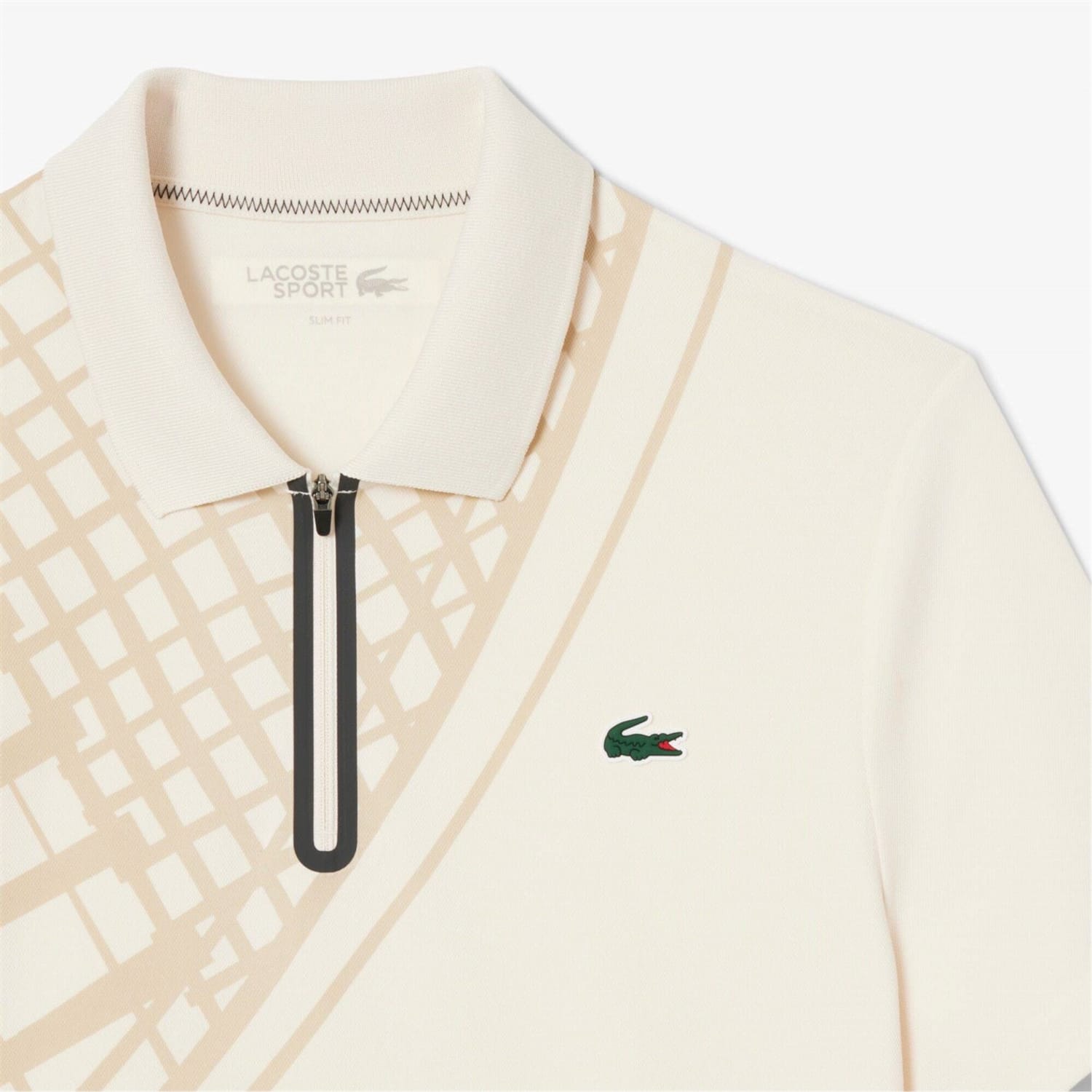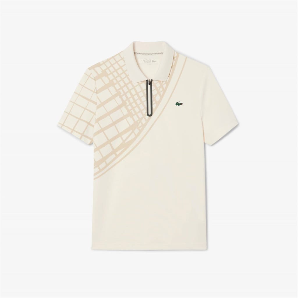 This Lacoste top features a geometric pattern and a polo collar, offering a stylish yet functional design. The short sleeves and regular fit ensure comfort, while the zip neck adds a modern touch. Ideal for performance activities, this top combines practicality with a contemporary aesthetic. -