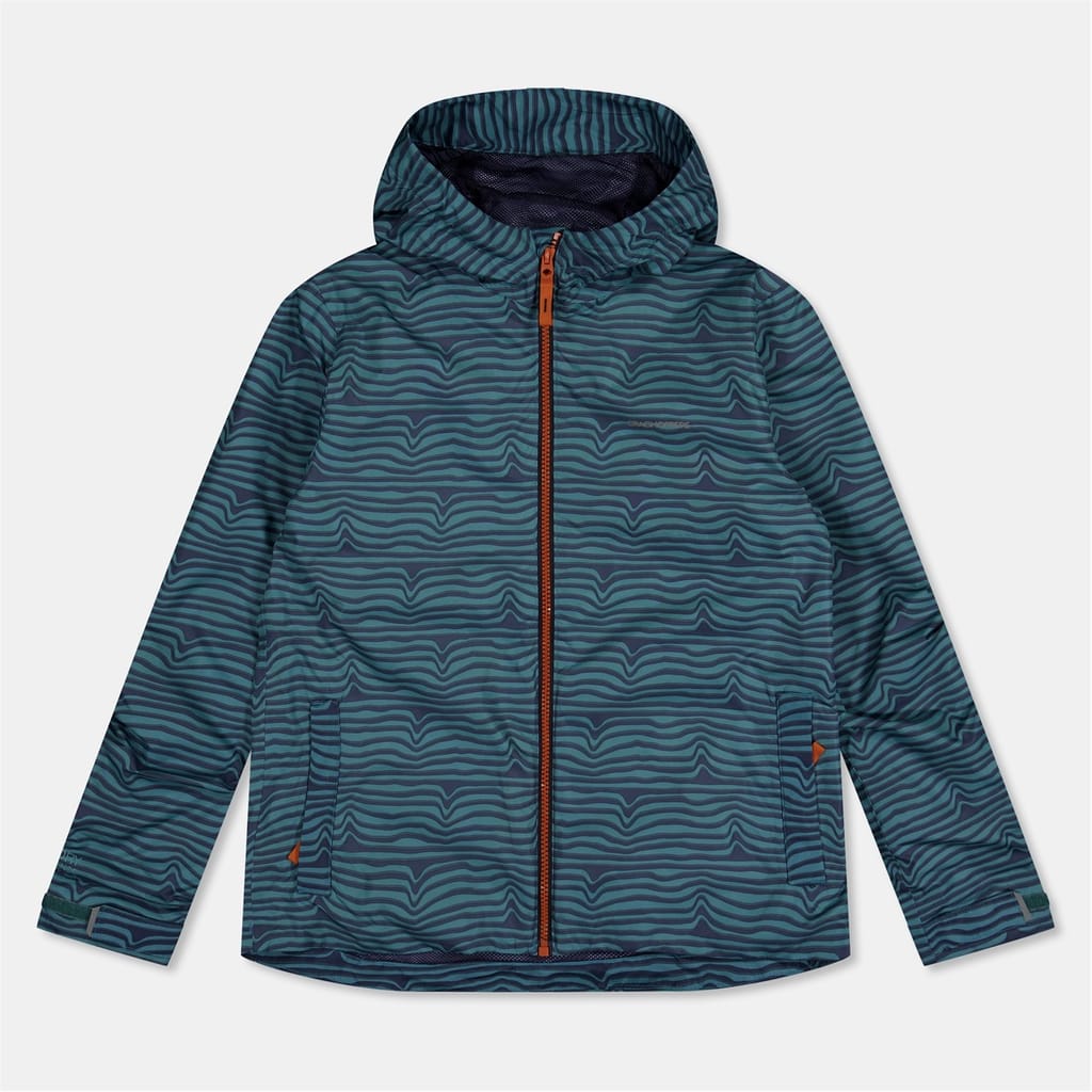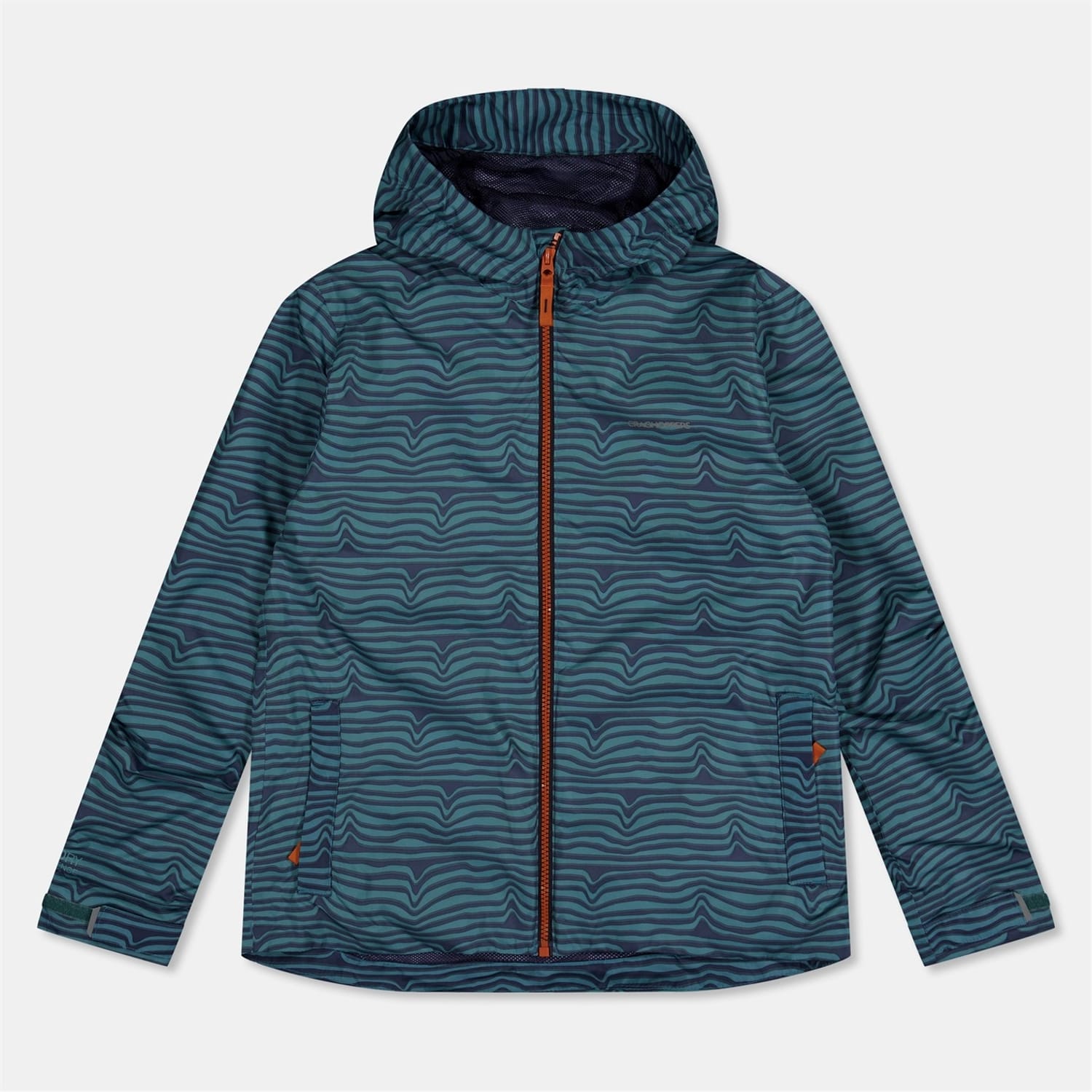 This Craghoppers jacket is designed for practicality and style. Featuring a hooded design, it offers water-repellent protection with a regular fit. The jacket includes a zipper closure, elasticated cuffs, and a curved hem. Embellished with a logo and pockets, it showcases a wave pattern, making it a functional choice for outdoor activities. -