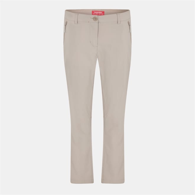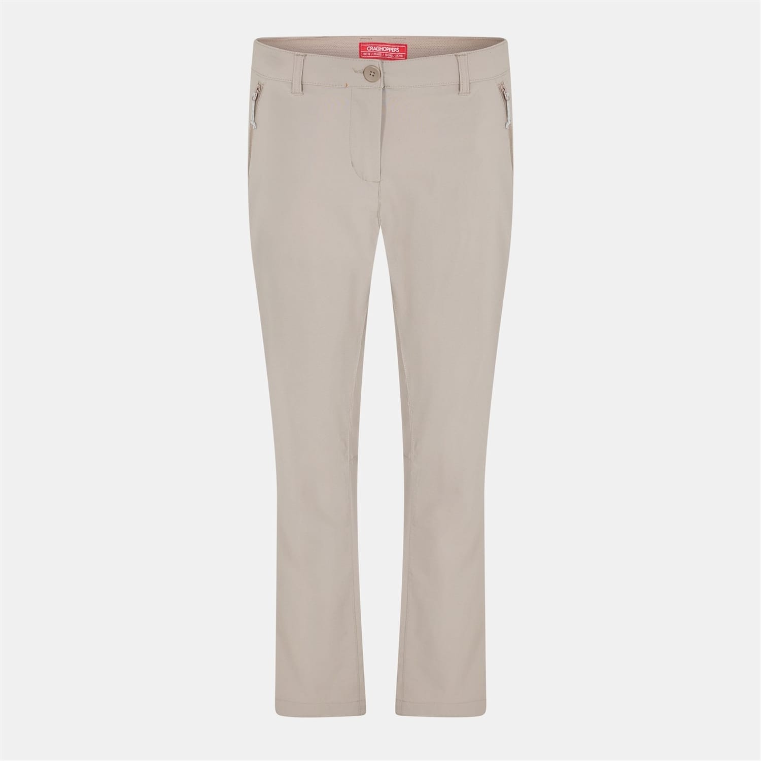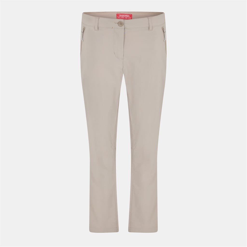 Craghoppers trousers are designed for walking enthusiasts. These pants feature a zip fly and snap button closure, ensuring a secure fit. The regular fit provides comfort, while the zipped pocket offers practicality. A subtle logo embellishment adds a touch of brand identity, making these trousers a reliable choice for outdoor adventures. -
