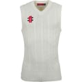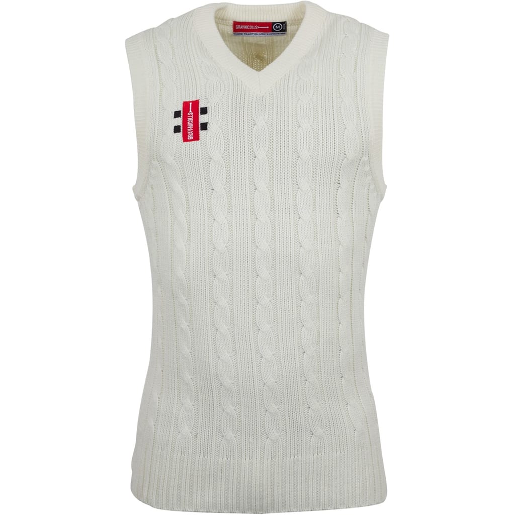 This Gray Nicolls sleeveless top features a stylish V-neck and a slim fit, perfect for a modern look. The cable knit pattern adds texture, while the logo embellishment and pocket provide functional details. -