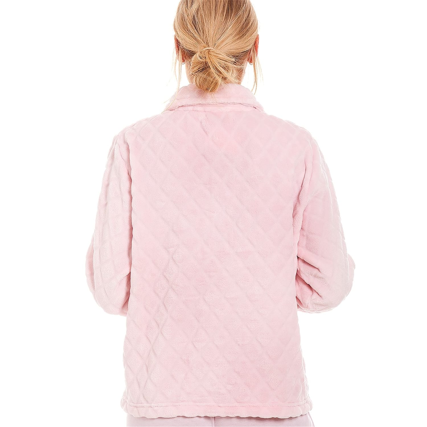 Keep cosy with this comfy, super soft fleece bed jacket. The length finishes on the hip line and the two side pockets make this a practical layer. This bed jacket features a textured diamond pattern for that classic look.