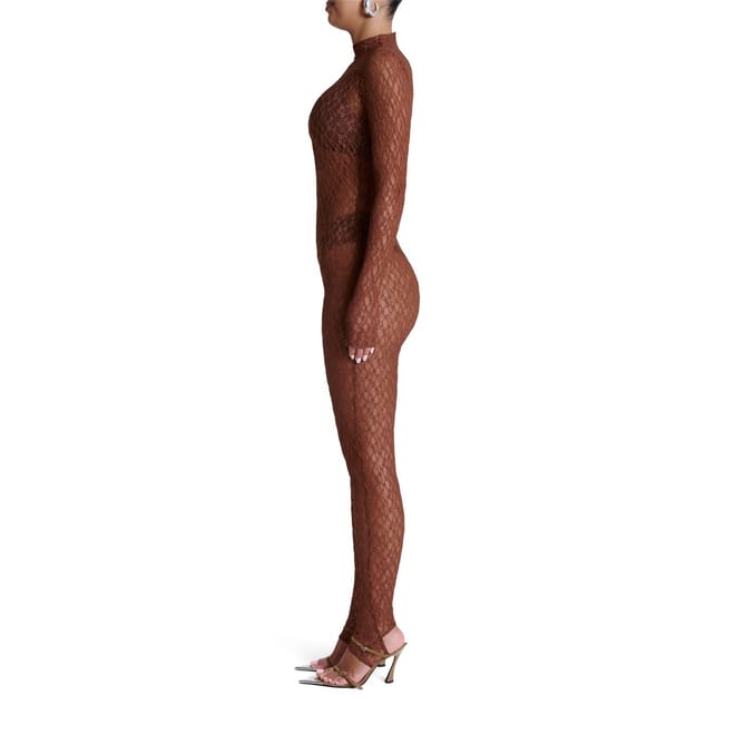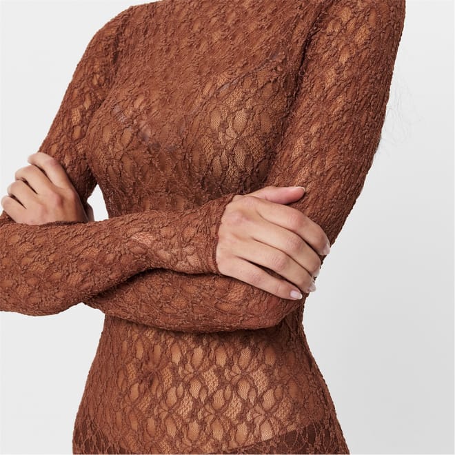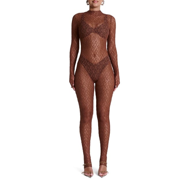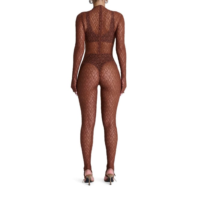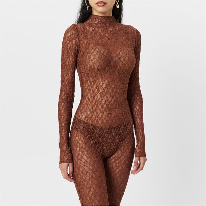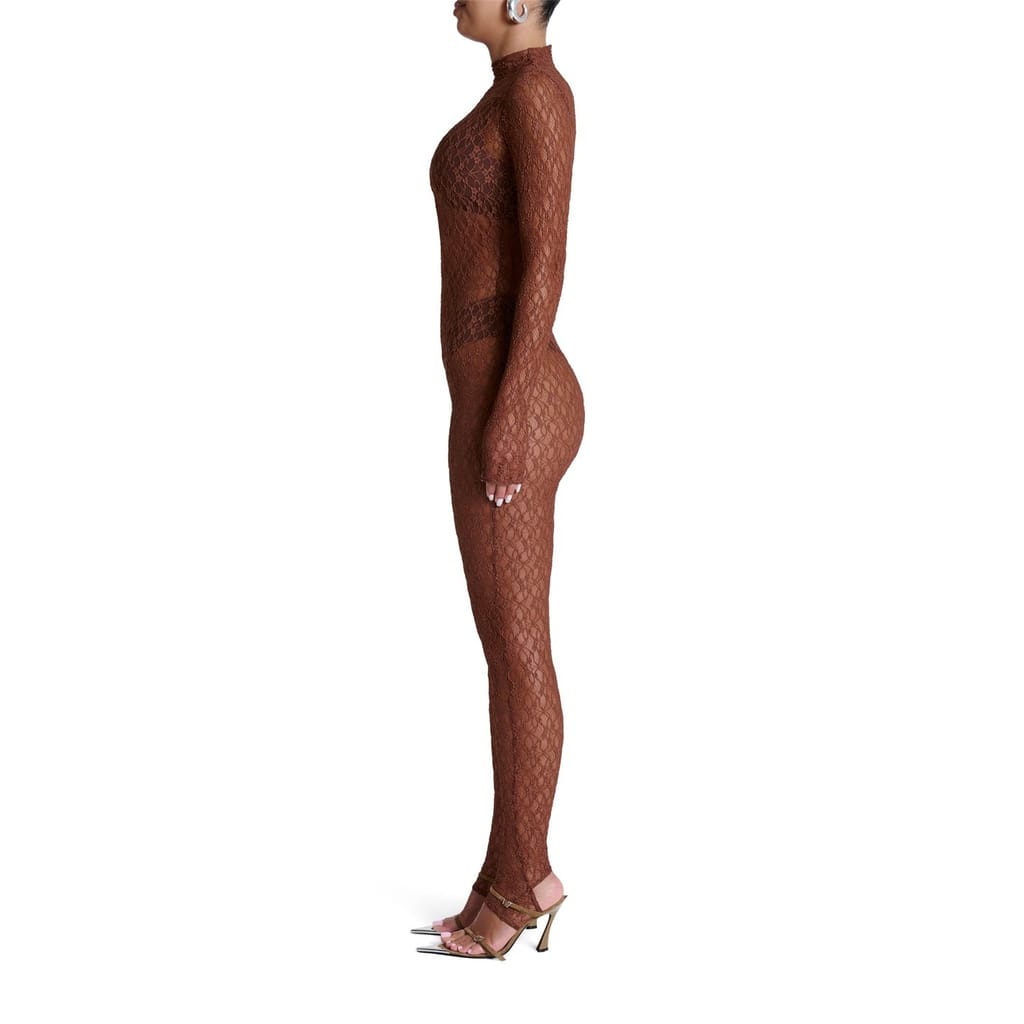 Strike the perfect balance between bold and delicate in Naked Wardrobe’s Stretch Lace Stirrup Jumpsuit. Crafted from sheer stretch lace, it features a sleek mock neck, long fitted sleeves, stirrup foot details, and a back zipper closure for a flawless fit. Layer with your choice of undergarments for added modesty. Ideal for fashion-forward nights out, parties, or statement events.