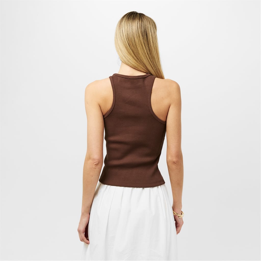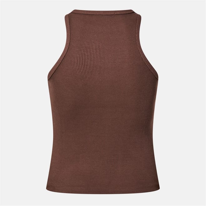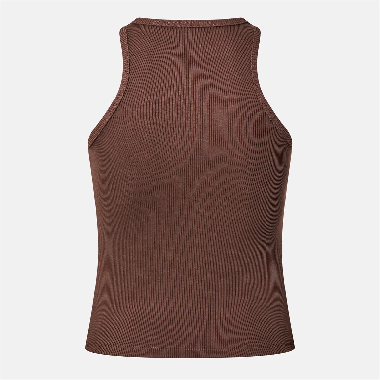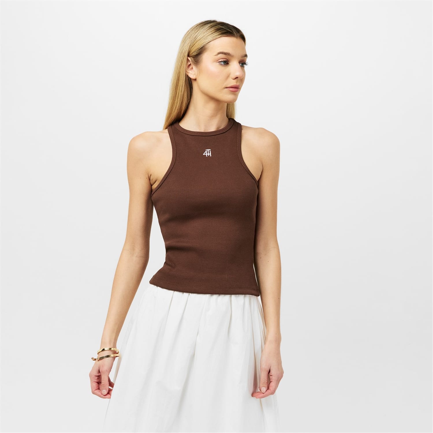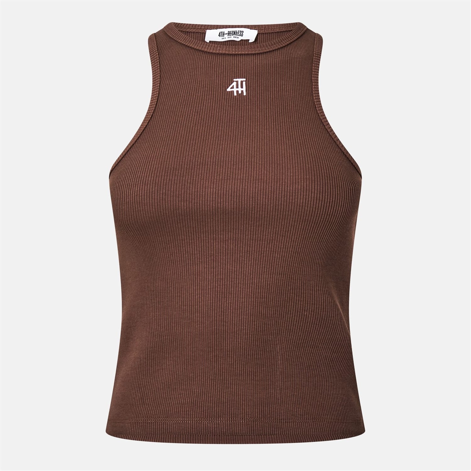 Discover the 4th & Reckless sleeveless top, featuring a high neck and slim fit for a sleek silhouette. This casual piece is adorned with a logo and showcases a ribbed pattern, adding texture and style to your wardrobe. -