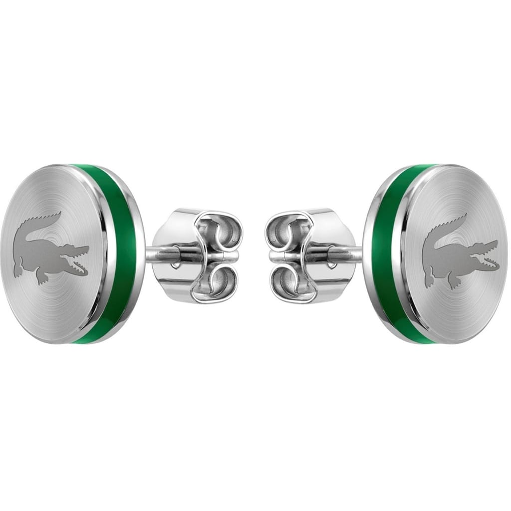 Composed of a bracelet, necklace, hoop, stud earrings, and a ring, the Lacoste Baseline collection adds a distinguished touch to any look. Each piece is etched with a signature crocodile and detailed with enamel piping in Lacoste green, emphasizing the brand's iconic DNA. A large croc on one side of the necklace pendant contrasts with a discreet logo on the reverse for a choice of looks, while the bracelet features a curved plate for an elegant finish. -