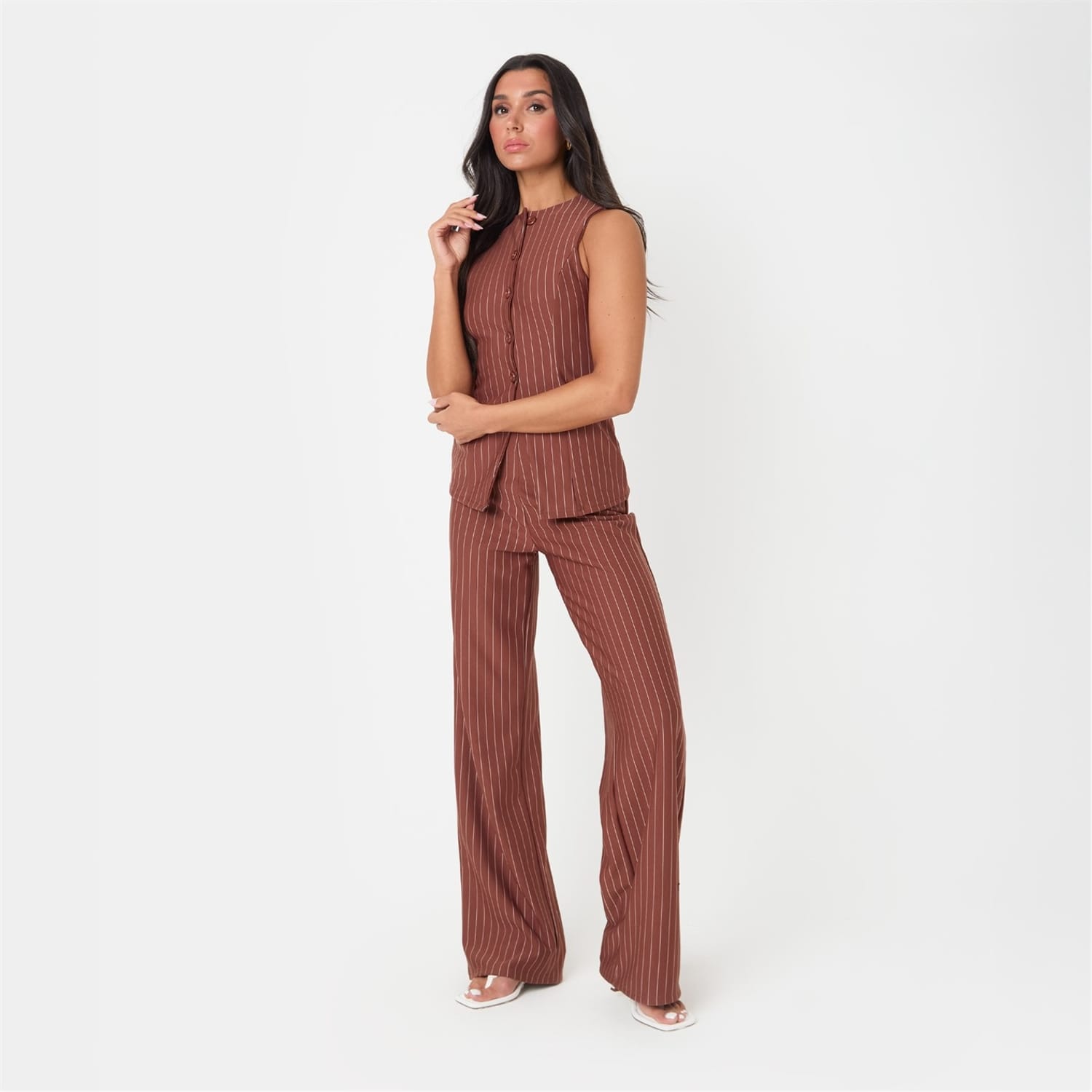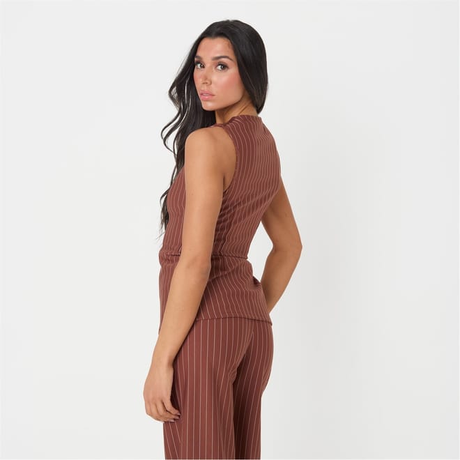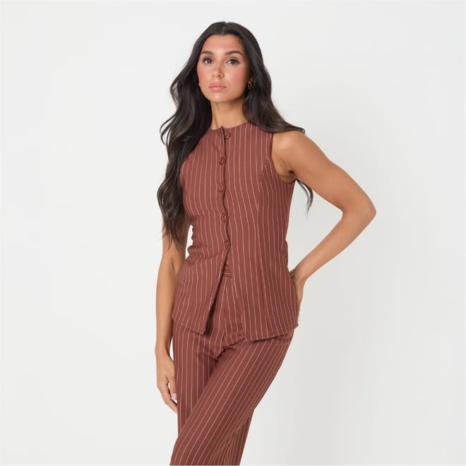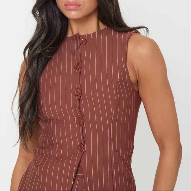 The pinstripe waistcoat is defined by its stripes. With a crew neck and angular hem, it buttons up at the front. Perfectly matched back with the Pinstripe Trousers, can be worn day to evening, wedding guest or for work.