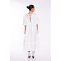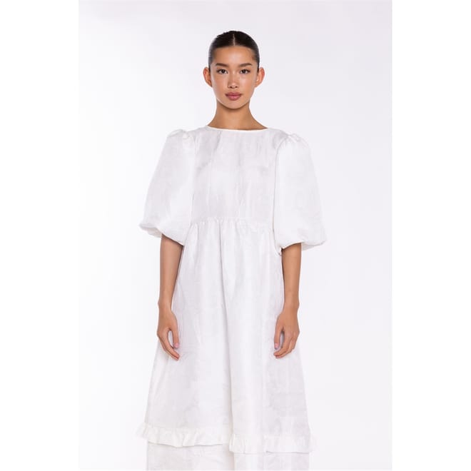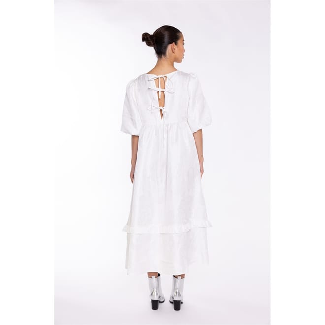 Glamorous Women's Off-White Brocade Tiered Tie-Back Midi-Dress. Embrace your inner romantic in this off-white brocade midi dress. The brocade fabric adds a touch of luxe, with its intricate floral pattern and soft sheen. The puff sleeves create a whimsical, vintage-inspired look, while the tie-back detailing allows you to adjust the fit to your liking. The tiered skirt adds movement and volume, perfect for twirling on the dance floor or strolling through a garden party. The midi length is both elegant and comfortable, hitting at the perfect spot on your legs. And as always, this dress is fully lined for your peace of mind. Pair it with some strappy heels and a delicate necklace for a look that's both timeless and on-trend. This dress is sure to become a go-to in your wardrobe, perfect for any occasion where you want to feel beautiful and confident..