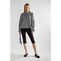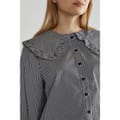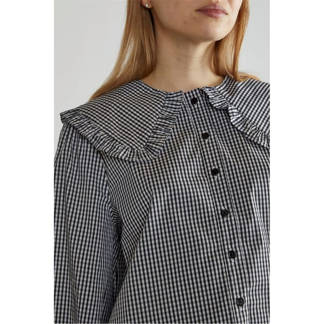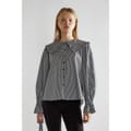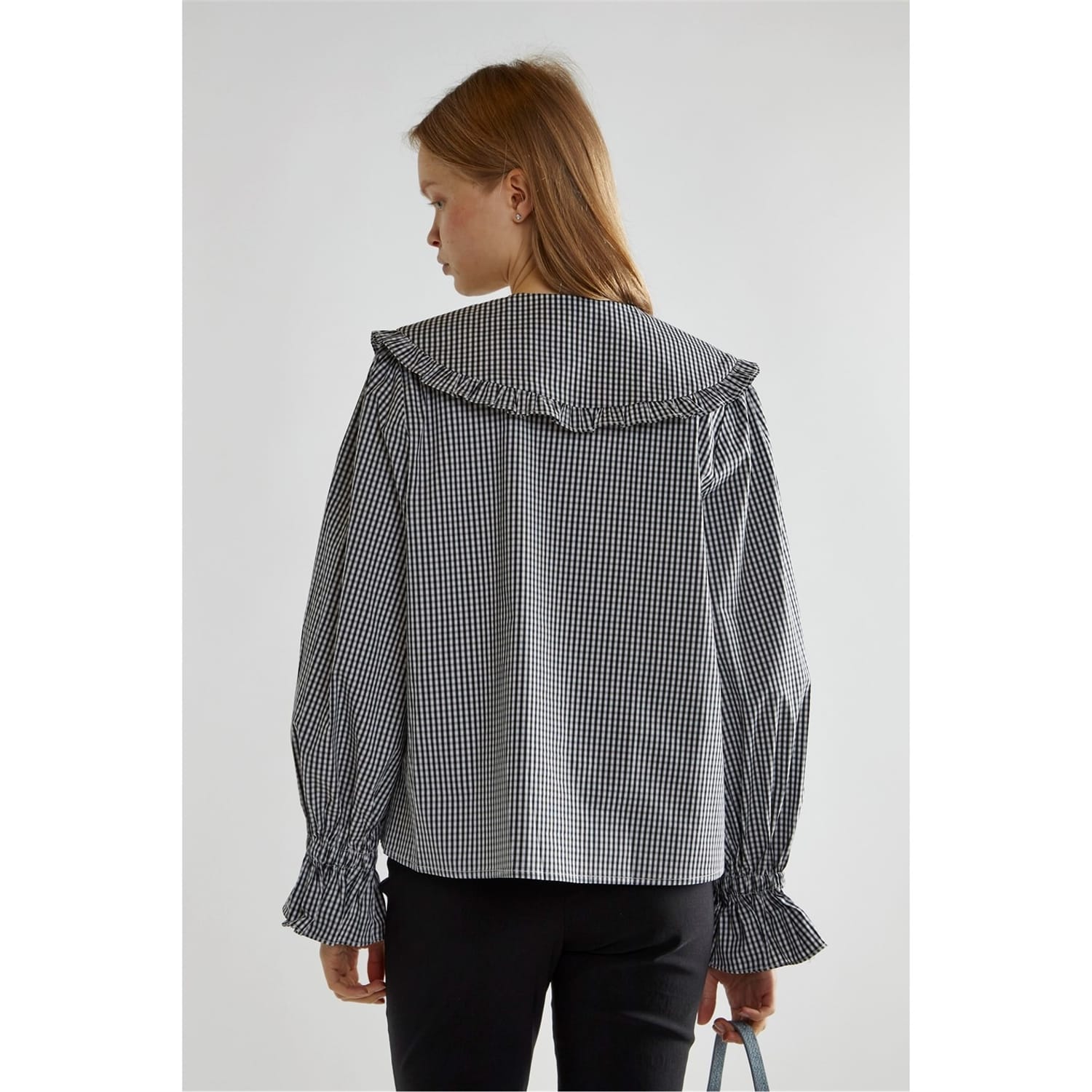 Glamorous Women's Black-White Gingham Statement-Collar Blouse. Our Black-White Gingham Statement-Collar Blouse is a charming blend of classic style and playful details. This eye-catching top features a timeless gingham pattern that adds a touch of retro flair to your wardrobe. The collared neckline gives it a polished look, while the button-front closure allows for easy wear and styling options. We've added cuffed wrists for a neat finish and comfortable fit. The standout feature is the delightful frill detailing, which adds a feminine touch and extra movement to the design. This versatile top is perfect for mixing and matching with various bottoms - pair it with jeans for a casual look or a skirt for a more dressed-up ensemble. The long sleeves make it ideal for cooler days or layering under jackets. With its combination of traditional gingham and modern frills, this top is sure to become a go-to piece in your closet, offering both comfort and style in one adorable package.