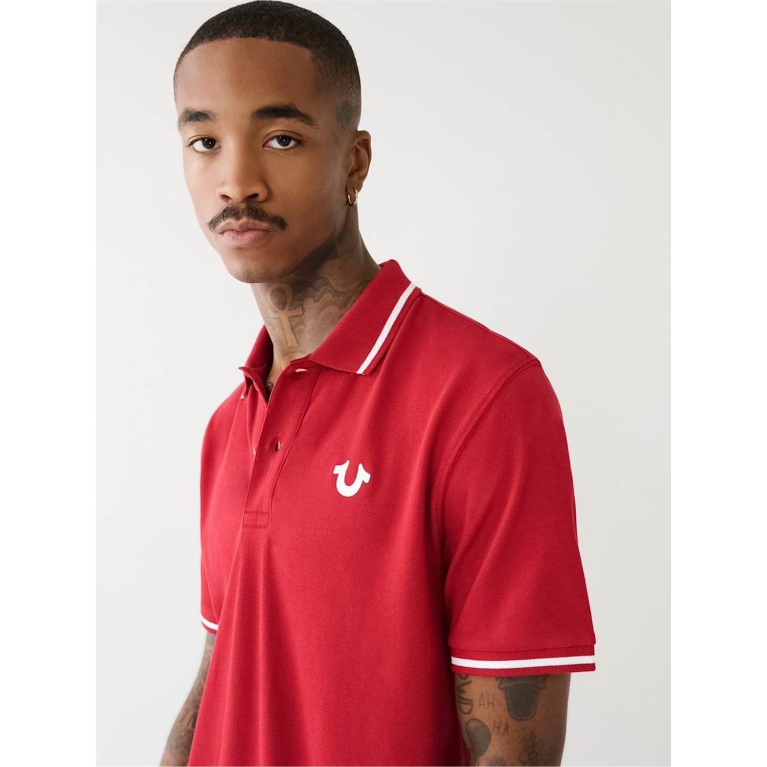 This True Religion top from the semi-formal collection features a regular fit with short sleeves and a polo collar. The button closure adds a classic touch, while the graphic print and logo embellishment with lettering provide a stylish edge. -