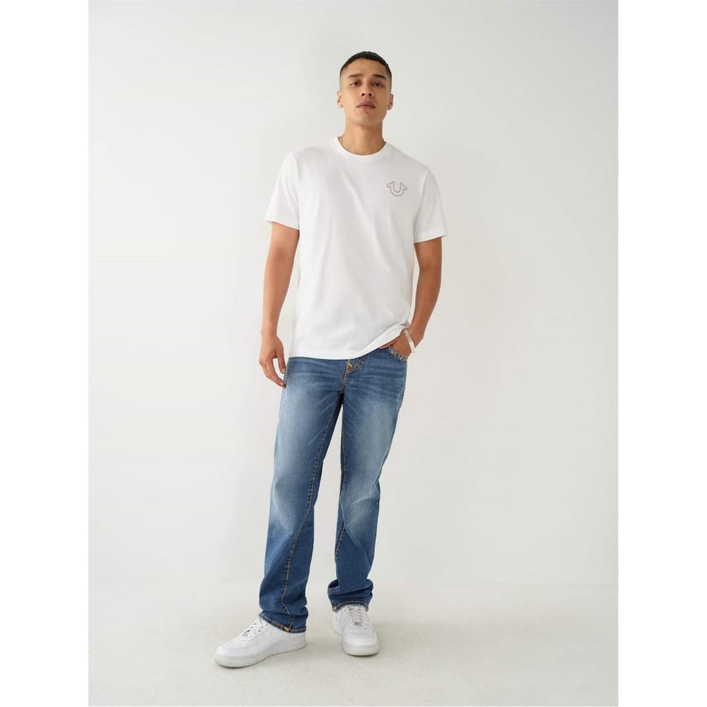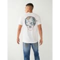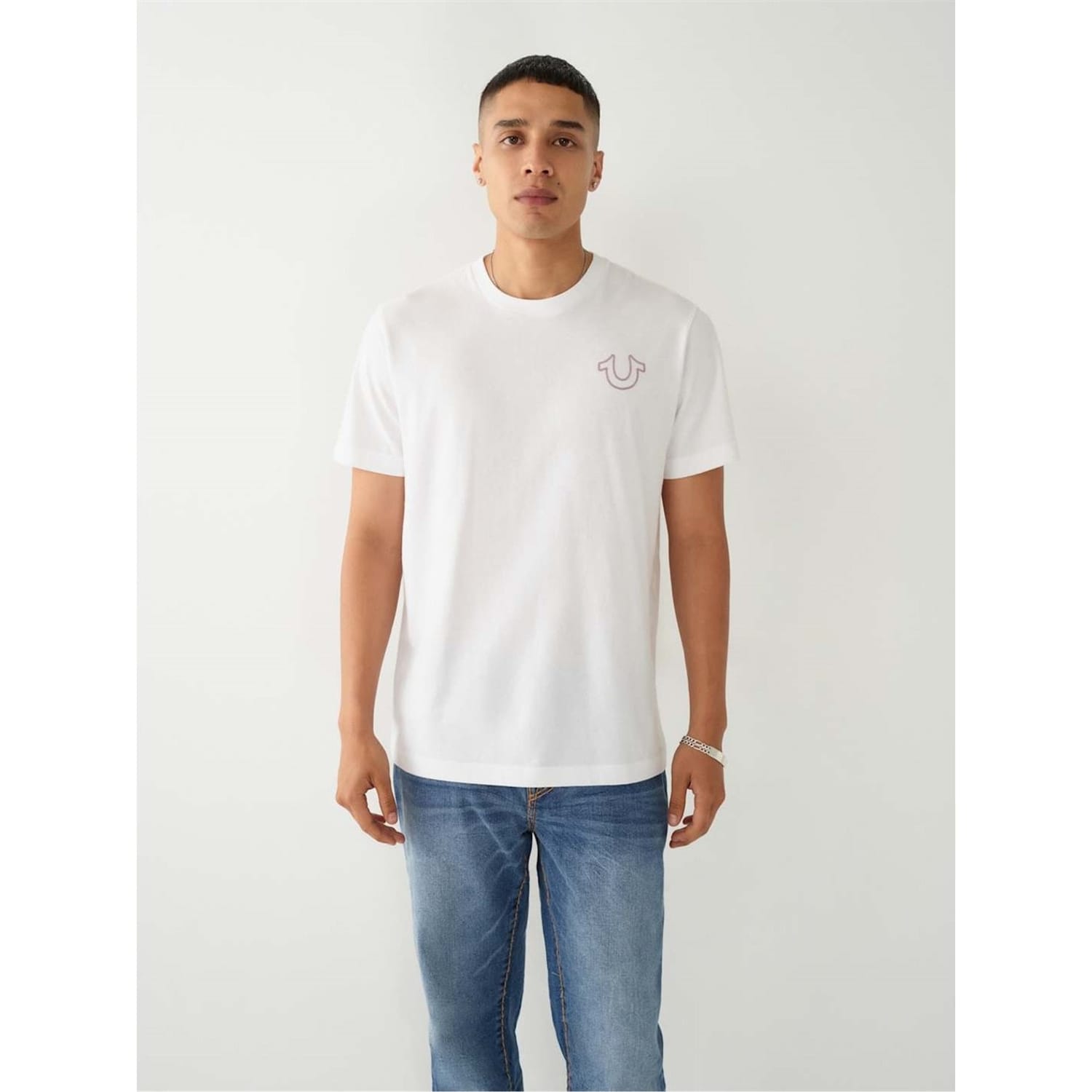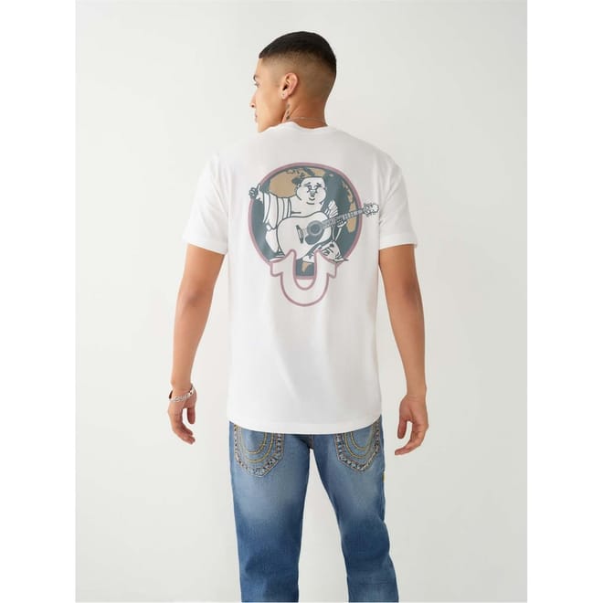 This True Religion top is a casual staple featuring a regular fit and short sleeves. The crew neck design is adorned with a distinctive Buddha print, adding a unique touch to the graphic print pattern. A subtle logo embellishment completes the look, making it a versatile addition to any wardrobe. -