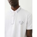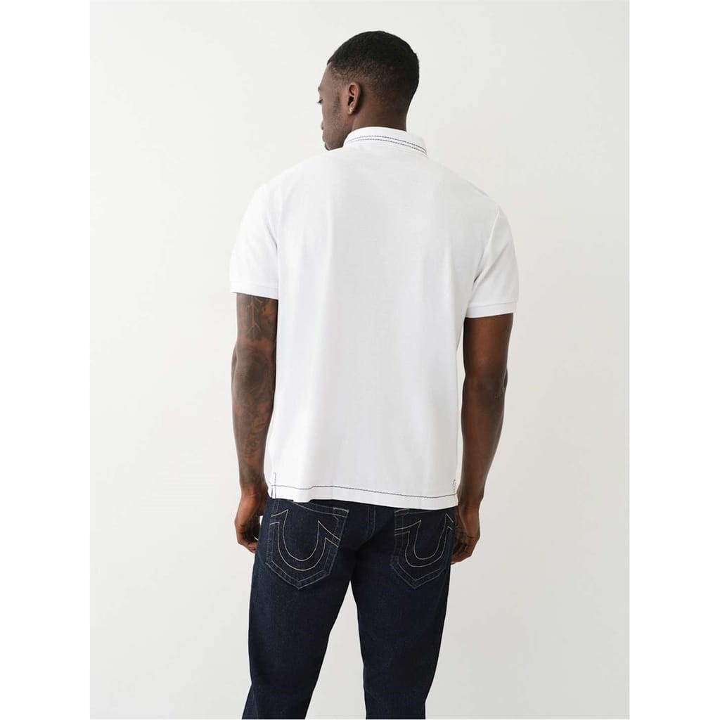 This True Religion top from the semi-formal collection features a relaxed fit with short sleeves and a polo collar. The solid pattern is complemented by a button closure and subtle logo embellishments. Intricate stitching adds a touch of detail to this versatile piece. -