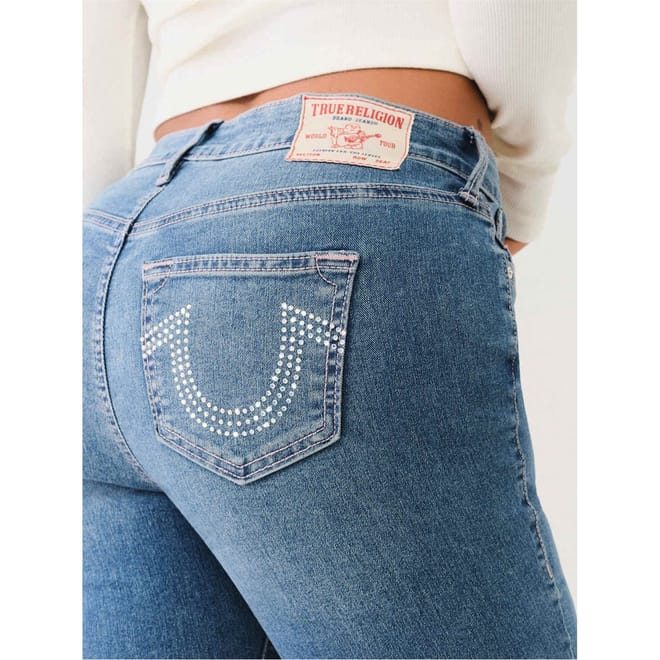 True Religion Jennie jeans offer a sleek skinny fit with a mid-rise design. Adorned with crystal embellishments, these jeans add a touch of sparkle to your wardrobe. Perfect for those who appreciate a blend of style and comfort. -