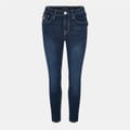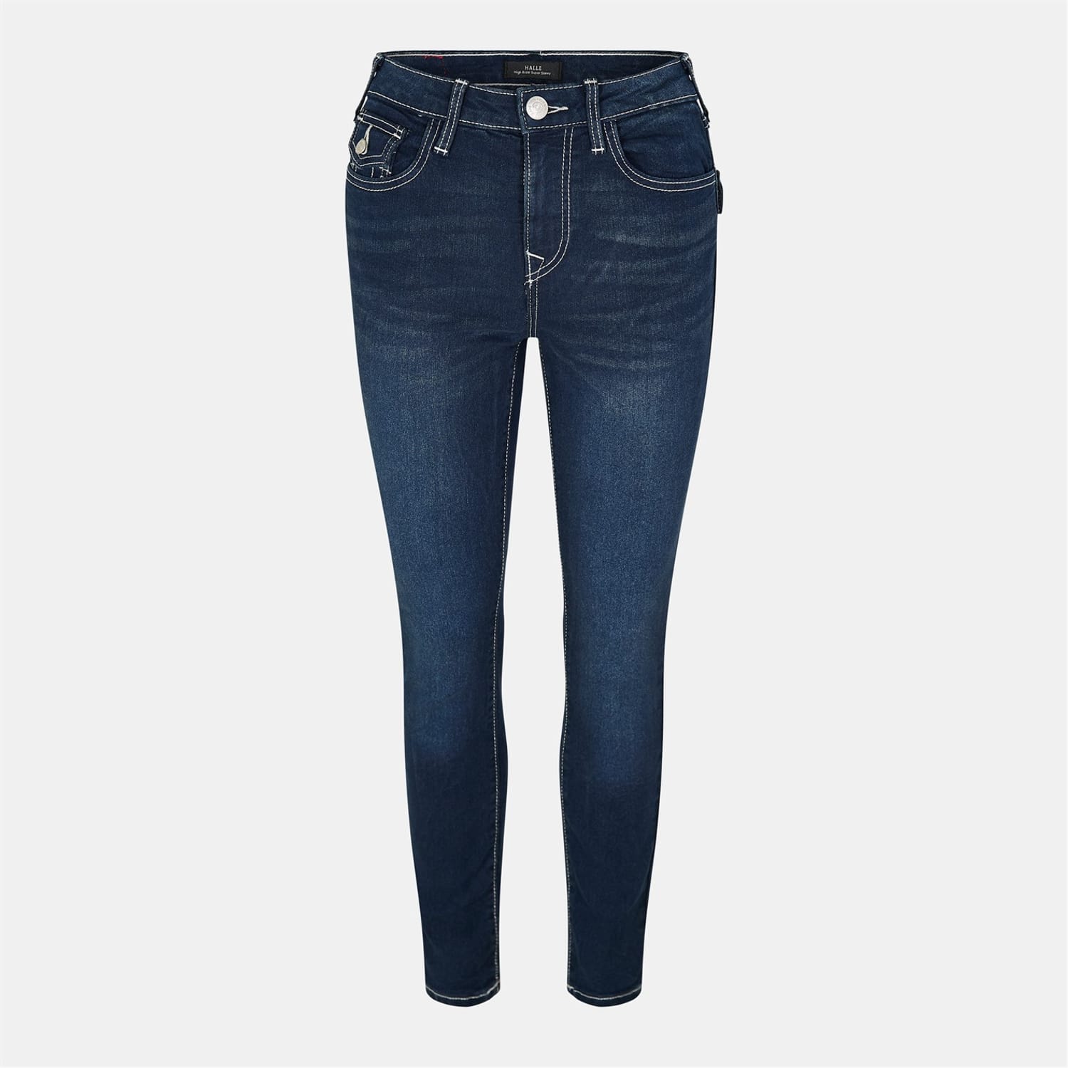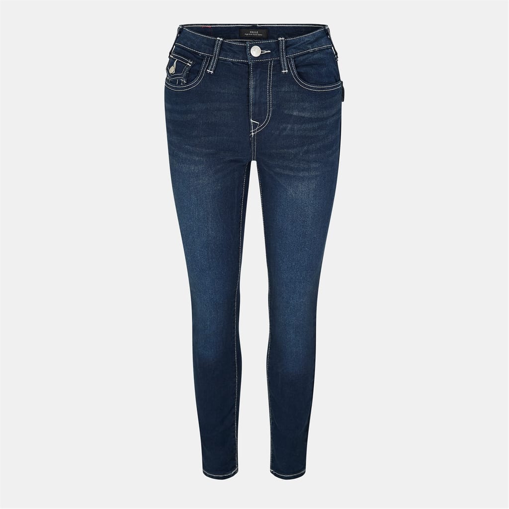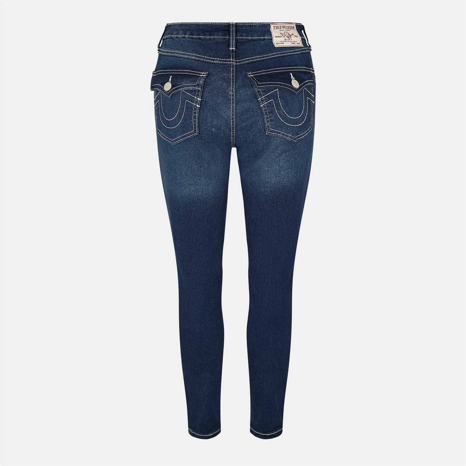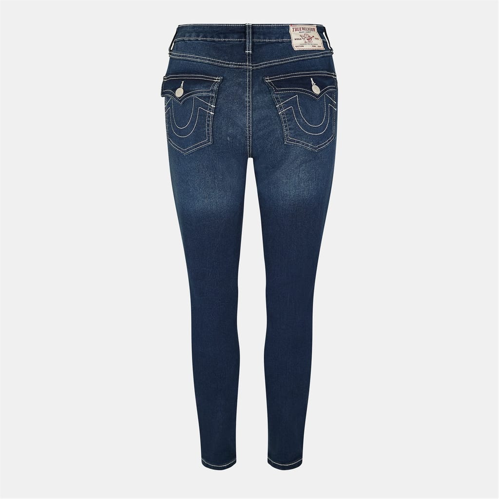 True Religion jeans feature a skinny fit with a zip fly and button closure. The design is enhanced by contrast stitching, adding a distinctive touch to the overall look. -