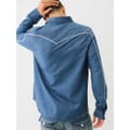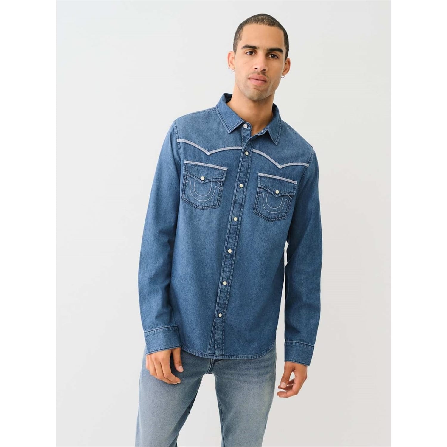 This True Religion top features a classic shirt collar and a button-down closure, offering a regular fit. The long sleeves and solid pattern provide a timeless look, while the pocket and contrast stitch embellishments add subtle detailing. -