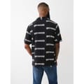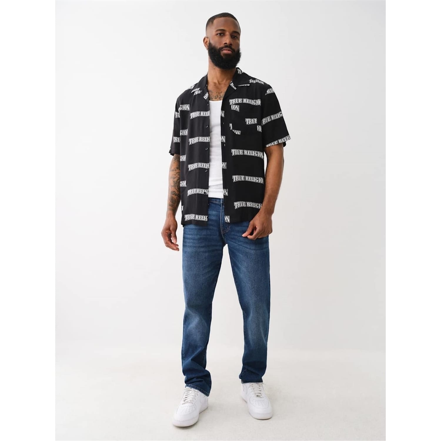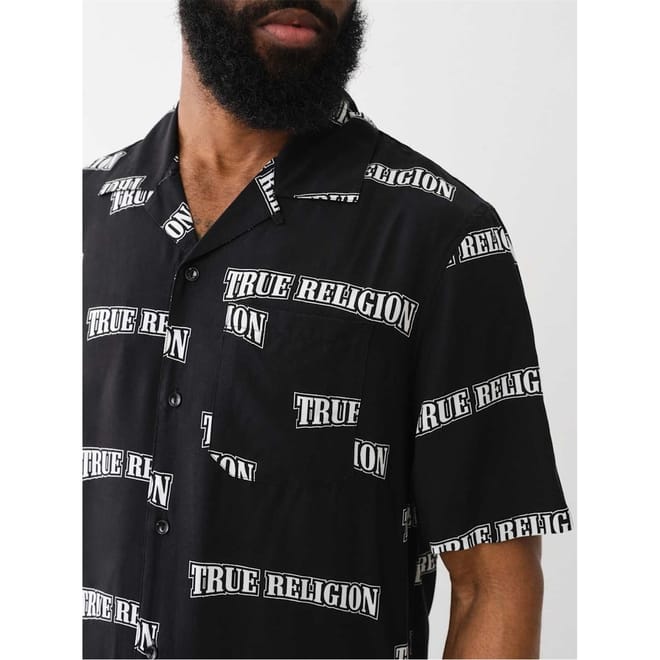 This True Religion top is a casual staple featuring a regular fit and short sleeves. The shirt collar and button-down closure add a classic touch, while the all-over logo print and lettering graphic provide a distinctive look. A logo embellishment completes the design, making it a versatile addition to any wardrobe. -