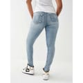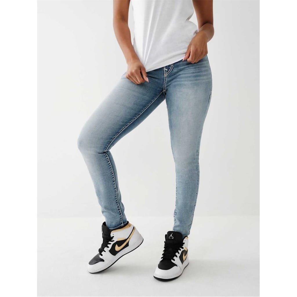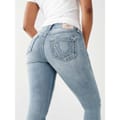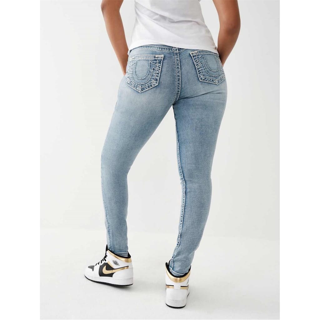 True Religion jeans feature a skinny fit with a zip fly and button closure. The design is enhanced with a distinctive logo embellishment, offering a stylish and modern look. -