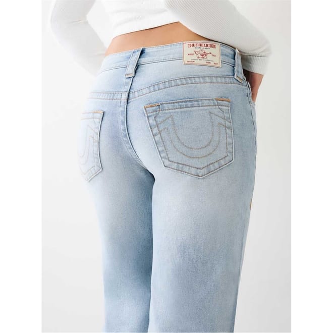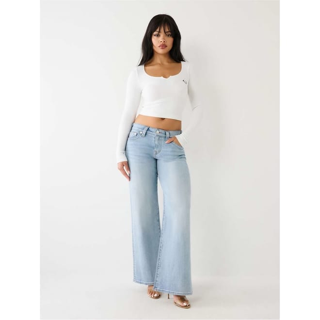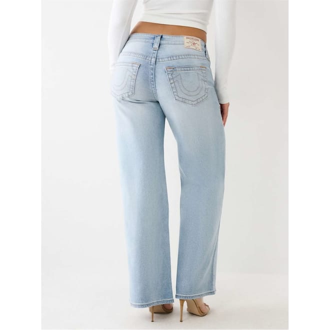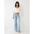 True Religion wide-leg jeans feature a zip fly and button closure, offering a relaxed fit with a wide leg cut. The design is accentuated by the brand's signature logo embellishment, adding a touch of distinction to the overall look. -