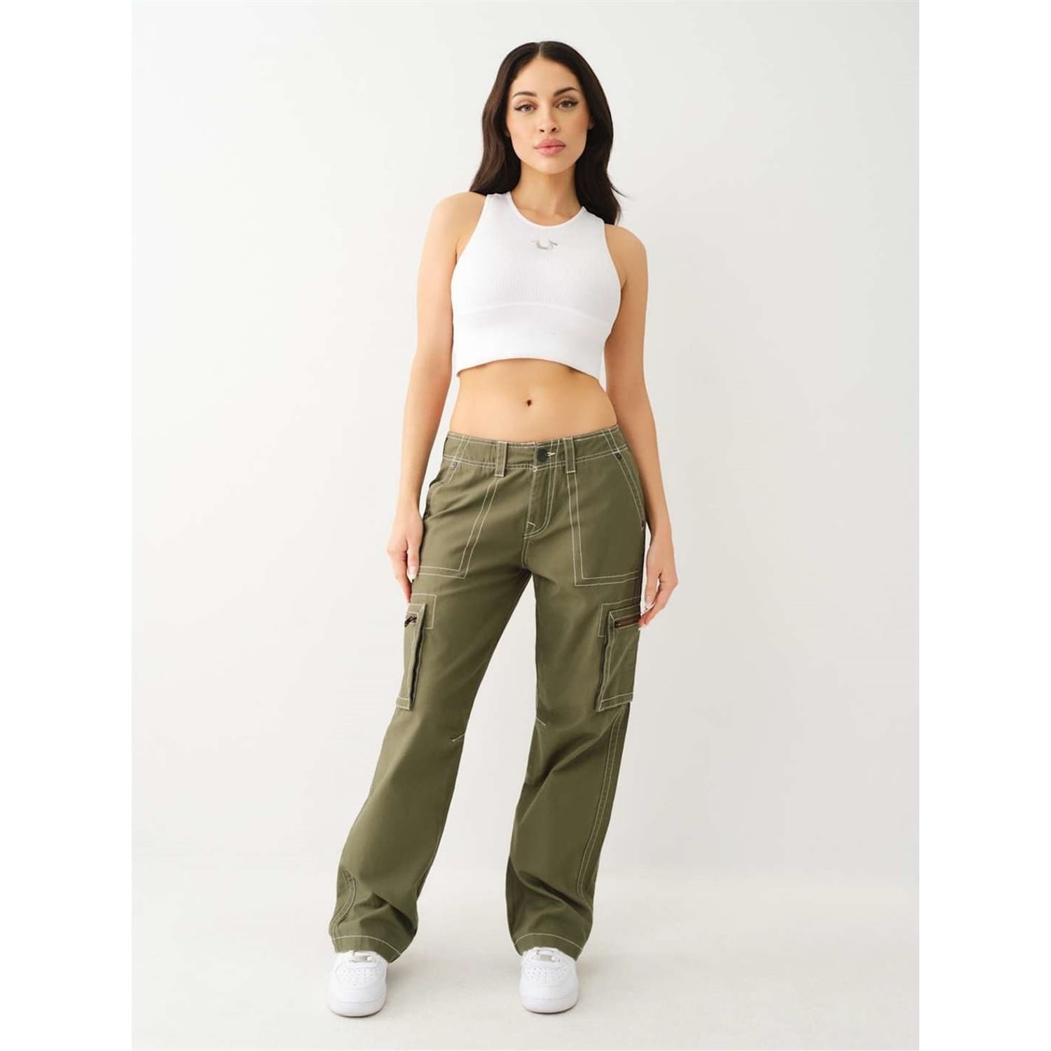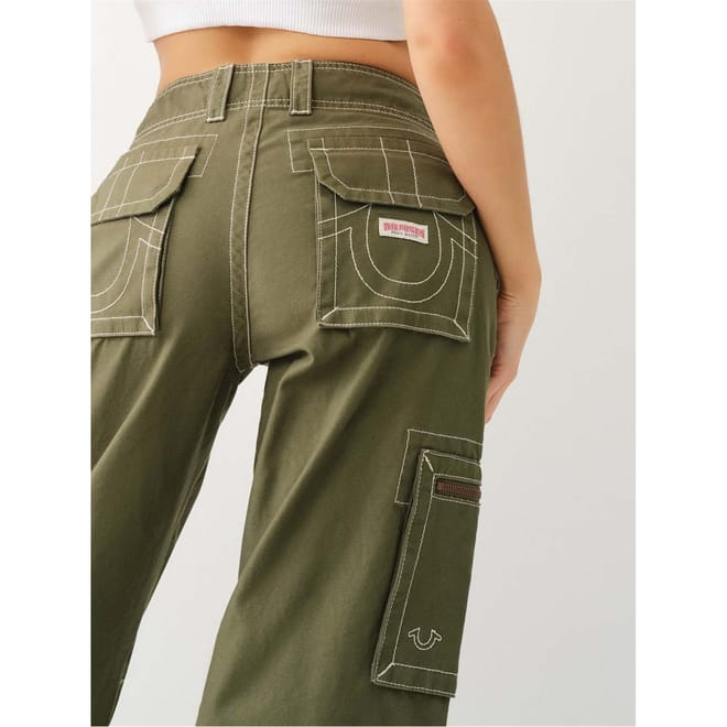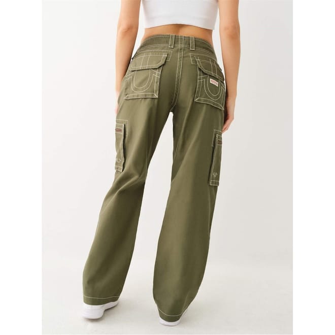True Religion cargo trousers offer a stylish and functional choice for casual wear. Featuring a zip fly and button closure, these wide-leg trousers are designed with practical pockets, making them both fashionable and convenient. Perfect for those seeking a blend of comfort and utility in their wardrobe. -