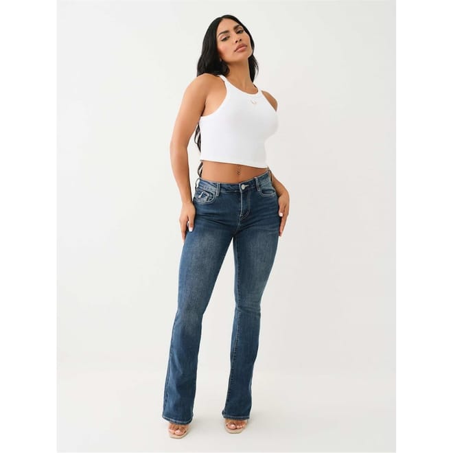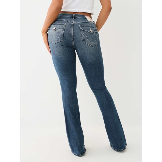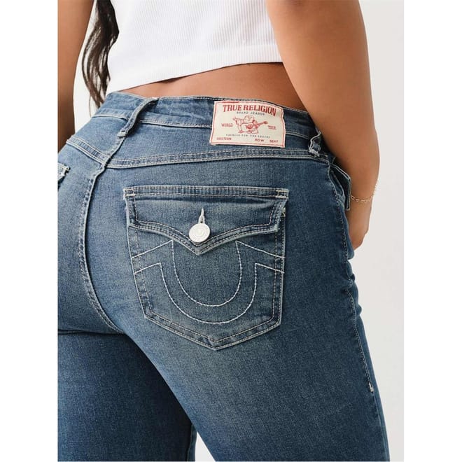 True Religion jeans feature a medium wash with a bootcut leg, offering a regular fit. The design includes a zip fly and button closure, complemented by the brand's signature logo embellishment. -