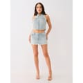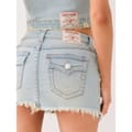 True Religion mini skirt features a slim fit and a stylish 5-pocket design. This casual piece is adorned with fringe embellishments, adding a unique touch to its look. The button closure ensures a secure fit, making it a versatile addition to any wardrobe. -