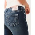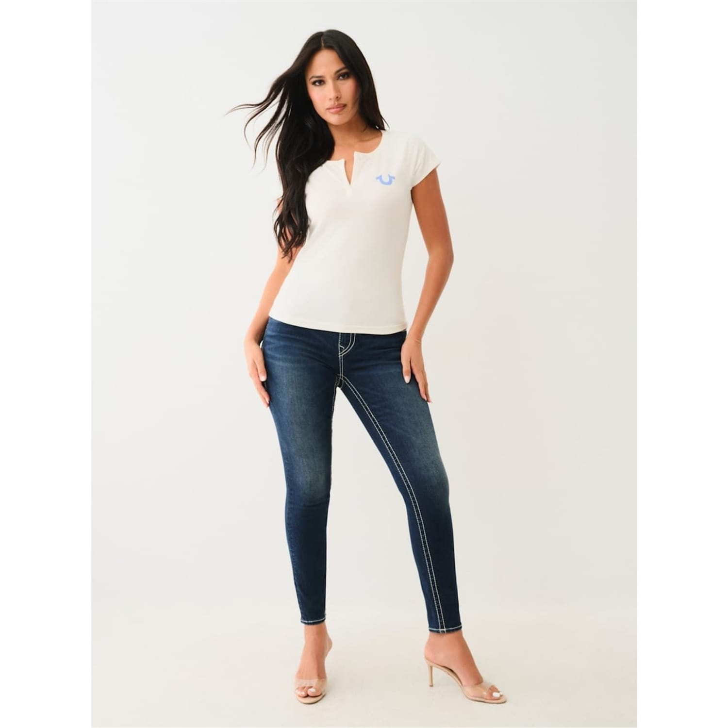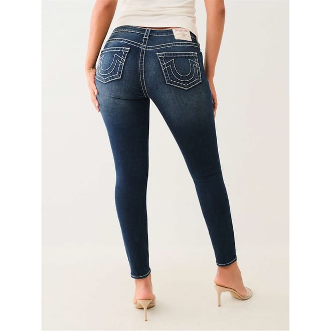Discover the True Religion Jennie jeans, featuring a skinny fit and a stylish zip fly with button closure. These jeans are adorned with a distinctive logo, back pocket detailing, and contrast stitching, offering a unique touch to your wardrobe. -
