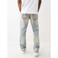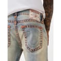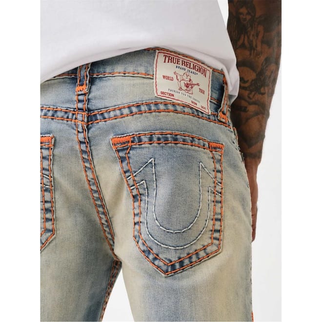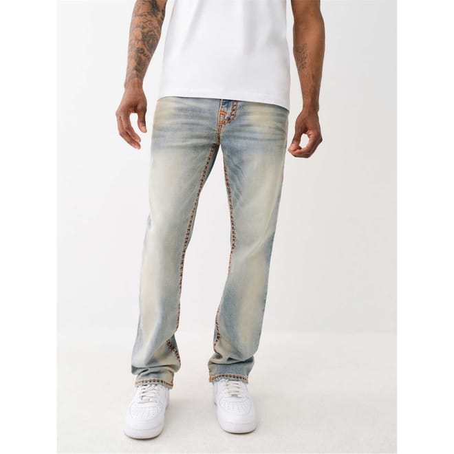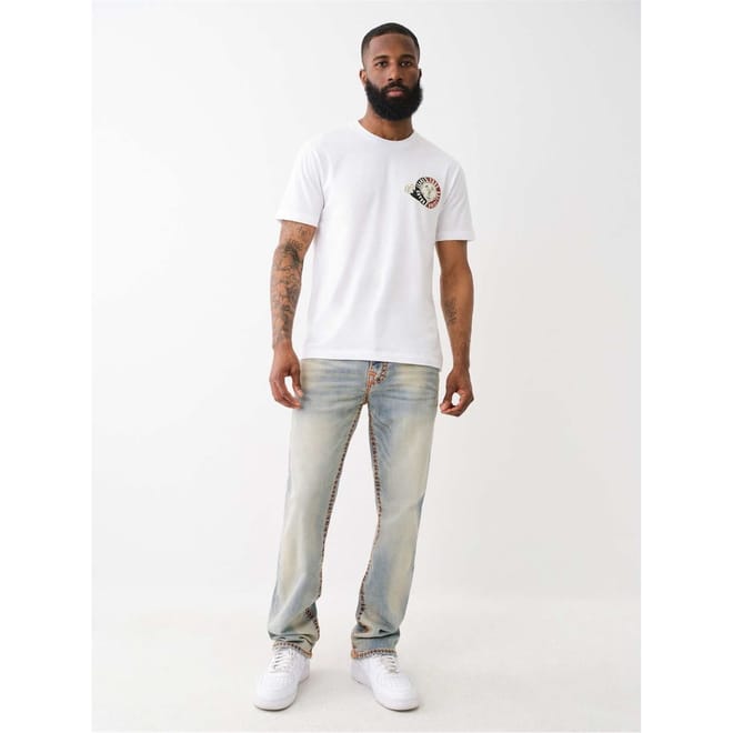 True Religion Ricky jeans feature a classic five-pocket design with a straight fit. The stone wash pattern and contrast stitch embellishments add a distinctive touch. These jeans are equipped with a zip fly and button closure, offering both style and functionality. -