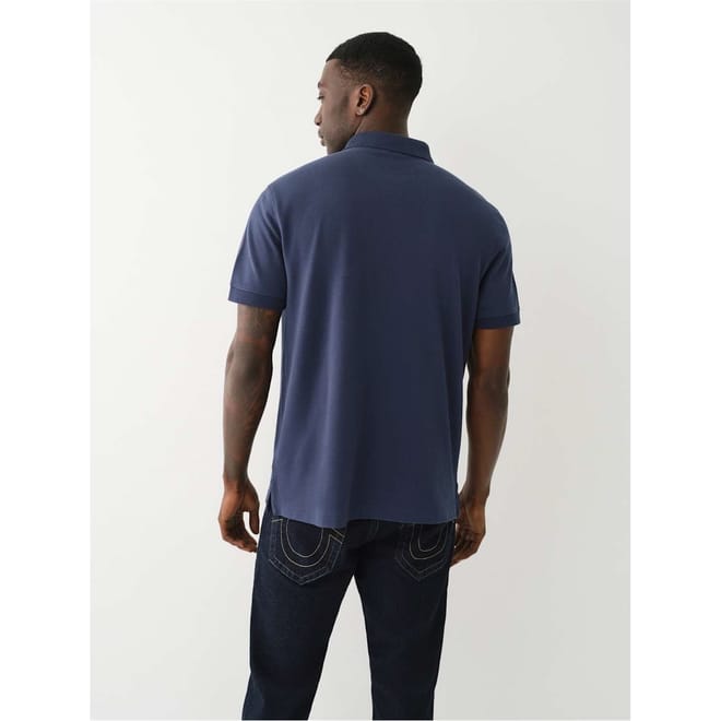 Discover the True Religion top, featuring a relaxed fit and short sleeves. This solid piece is adorned with a distinctive Buddha print and a logo patch, adding a unique touch. The polo collar and button-down closure offer a classic look, making it a versatile addition to your wardrobe. -