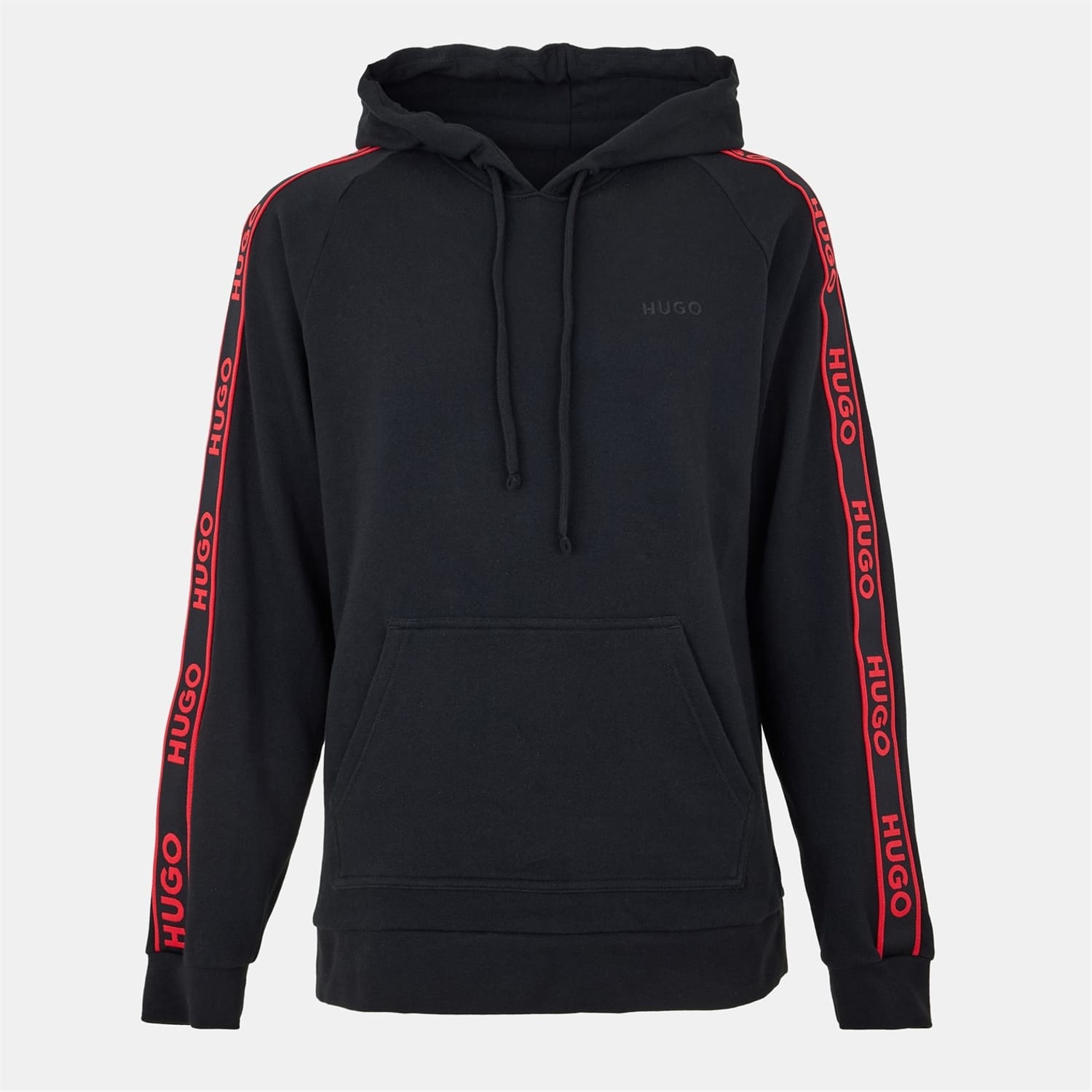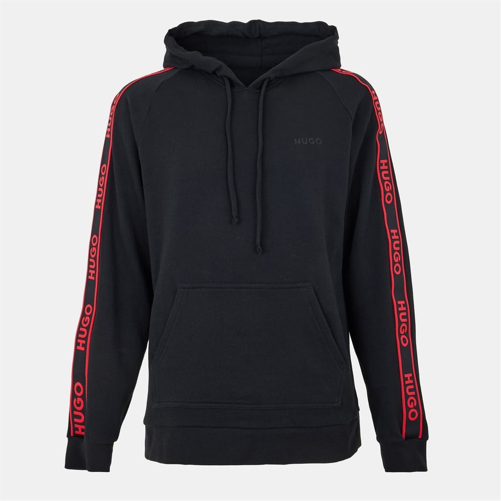 The Hugo Liam top features a hooded neck and long raglan sleeves, offering a regular fit. It includes a drawstring closure and ribbed cuffs for added comfort. The design is enhanced with a kangaroo pocket, logo print, and logo tape embellishments, making it a stylish choice for casual wear. -
