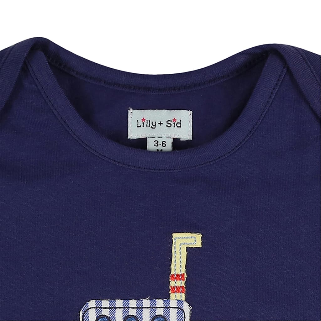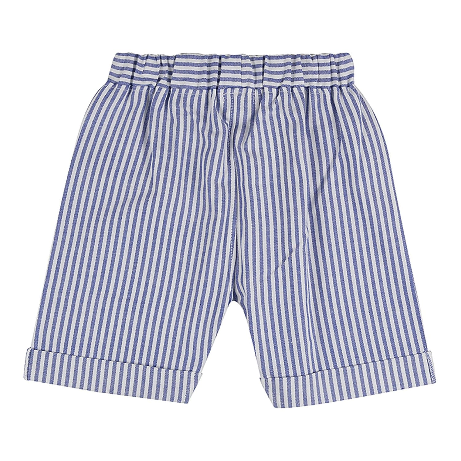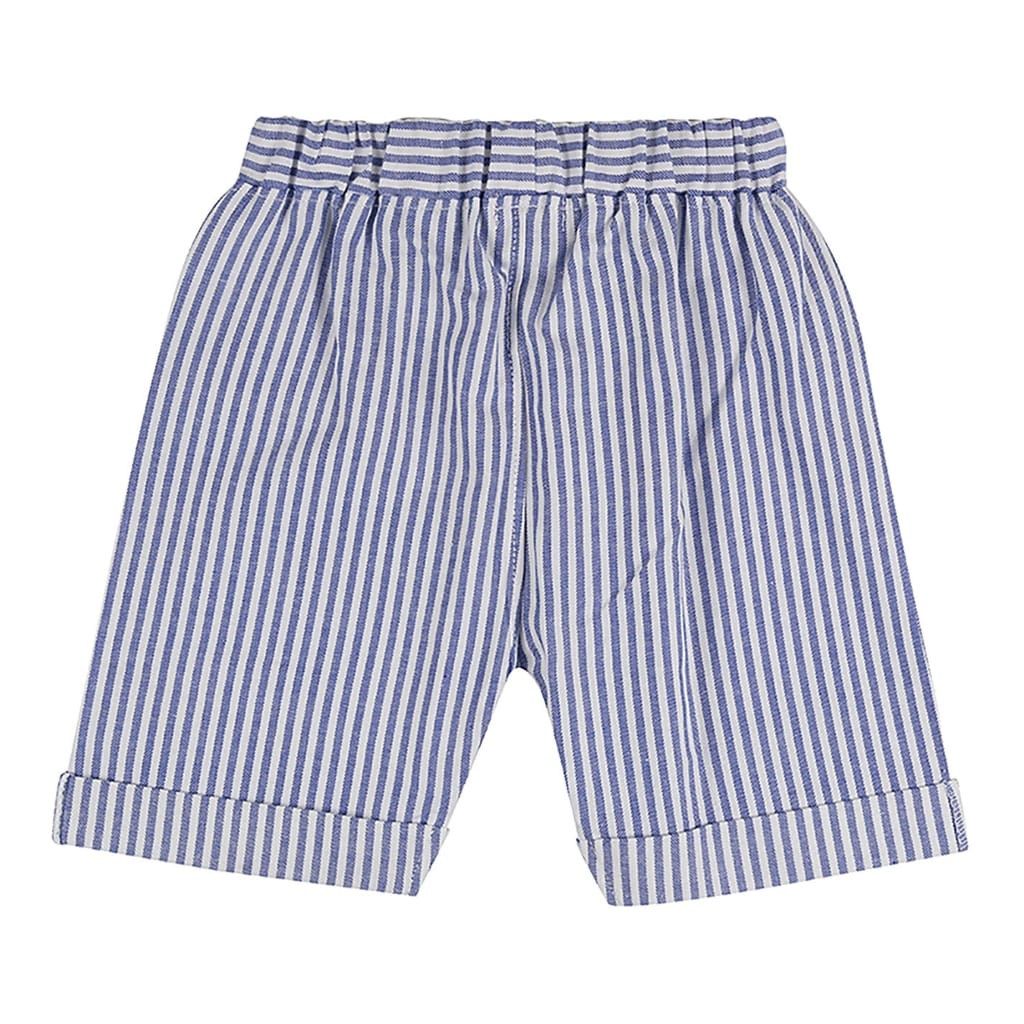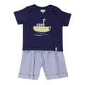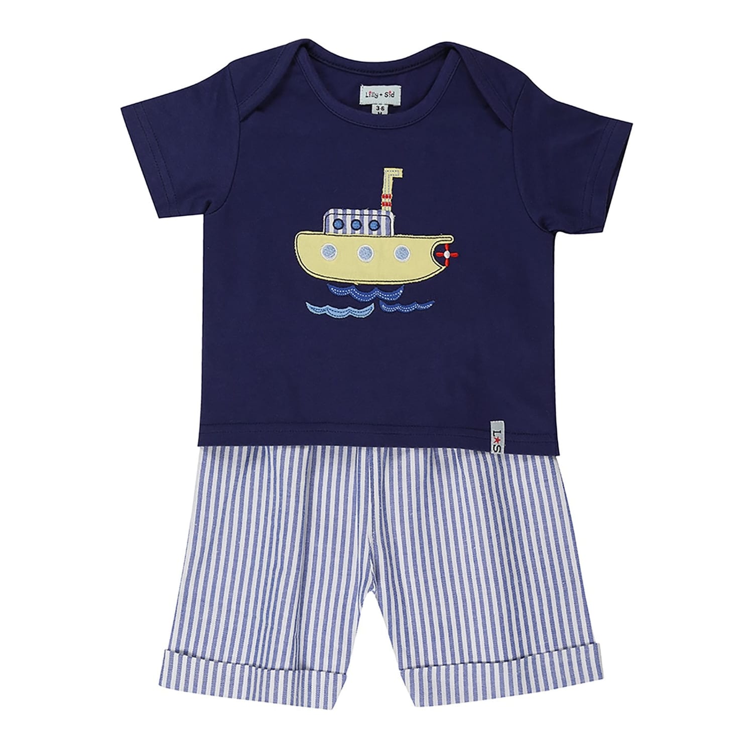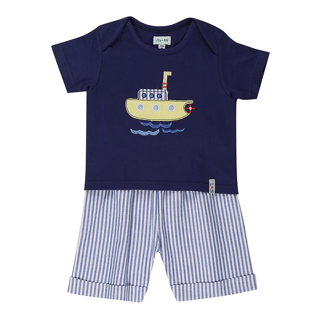 Discover the Lilly & Sid top short set, perfect for casual outings. This set features a stripe pattern with a crew neck t-shirt and plain short sleeves. The casual shorts are styled in a bermuda design, offering comfort and style. The set is adorned with applique and embroidered embellishments, adding a unique touch to your casual collection. -