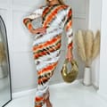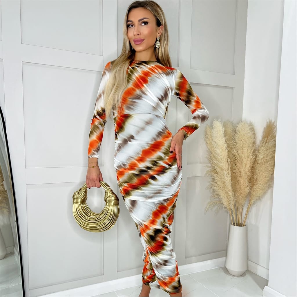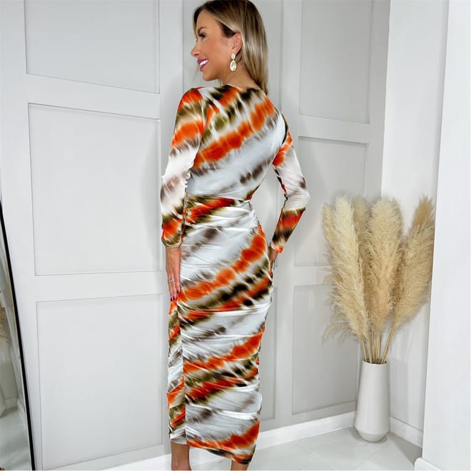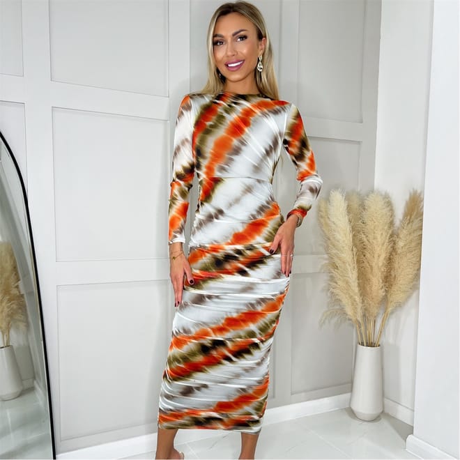 Look sophisticated in our Cream And Orange Abstract Print Mesh Long Sleeve Bodycon Midi Dress. Featuring a ruched top and midi length mesh skirt with lining, long mesh sleeves and a round neck. Pair with minimal jewelry and heels to complete the look!