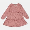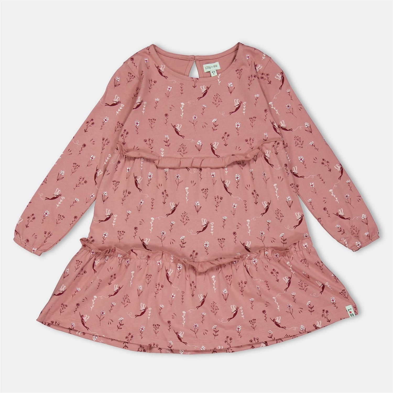 This Lilly & Sid jersey dress features a charming floral pattern, perfect for adding a touch of elegance to any wardrobe. Designed with a knee-length cut, it offers a classic crew neck and long sleeves for a comfortable fit. The dress is beautifully finished with a ruffle hem, adding a playful element to its overall design. -