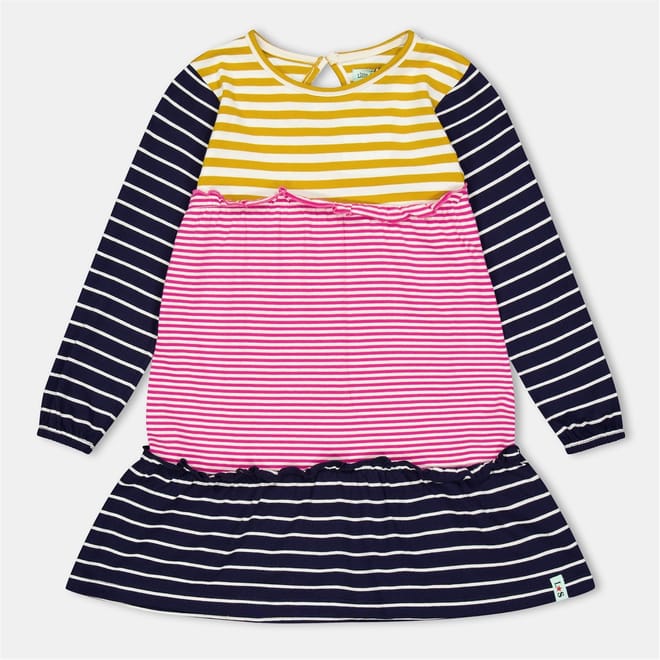 Lilly & Sid presents a charming tiered dress featuring a stripe pattern. This knee-length piece is designed with a crew neck and long sleeves, offering a regular fit. The dress is adorned with ruffle embellishments and a ruffle hem, adding a playful touch to its overall design. -