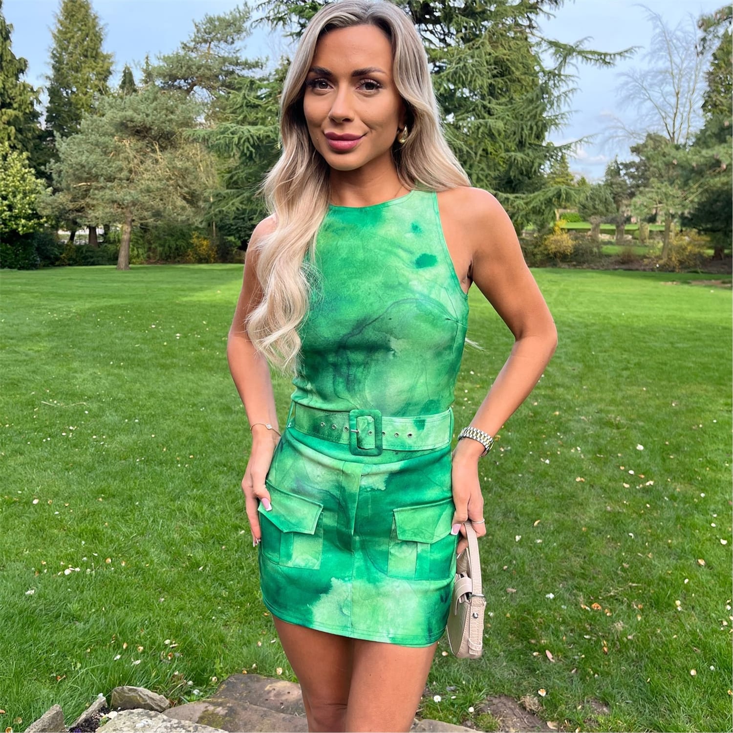 Unsure whether to wear a mini dress or shorts Our Green Tie Dye Round Neck Belted Skort Cargo Playsuit is the perfect combination of both! Featuring a round neckline, belted waist, front pockets and zip up back. Wear it with sandals or trainers during the day or dress it up with heels for a summer night out.