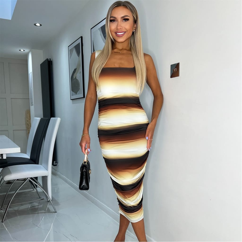Upgrade your weekend wardrobe with our Brown Ombre Printed Square Neck Sleeveless Bodycon Midi Dress. Perfect for parties, cocktails with the girls and date nights, it features a sleeveless design, square neck, a ruched silhouette with lining and a midi skirt. Team it with barely there heels and a matching bag for a head-turning look.