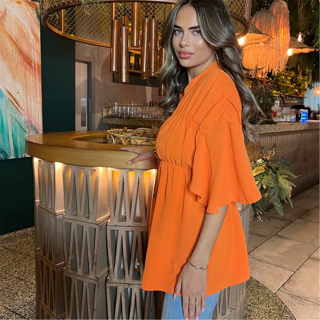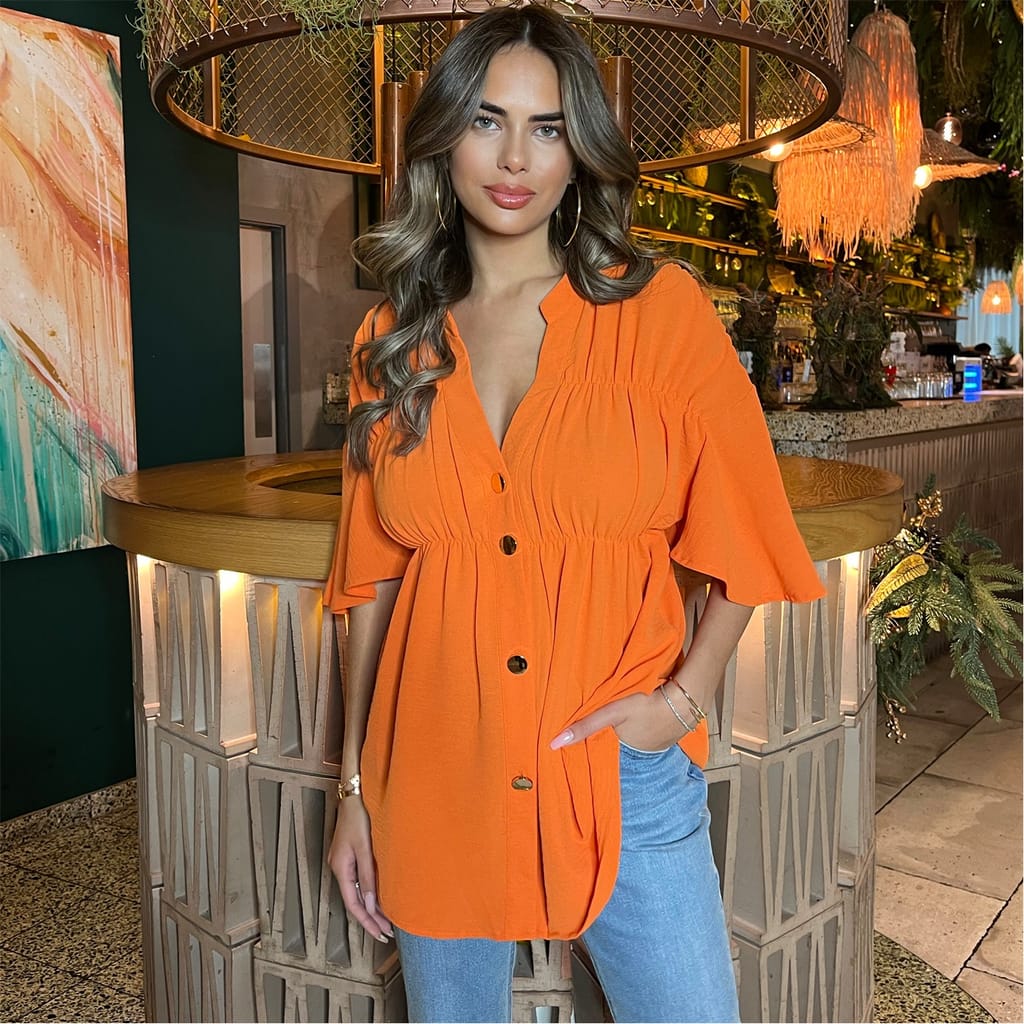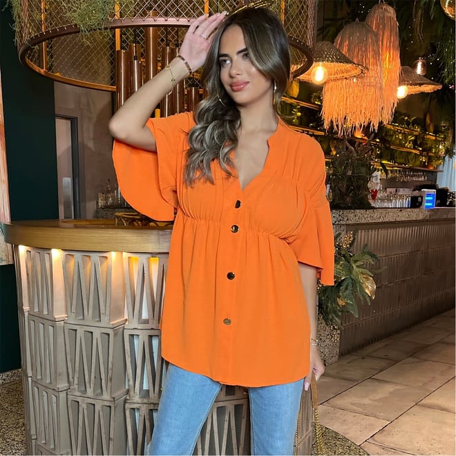 This Orange Button Up Ruched Detail Smock V-Neck Top is the perfect seasonal staple. It has ruched detailing across the bust and shoulders, short sleeves and front statement gold buttons. Pair with jeans and wedges for a casual yet sophisticated look!