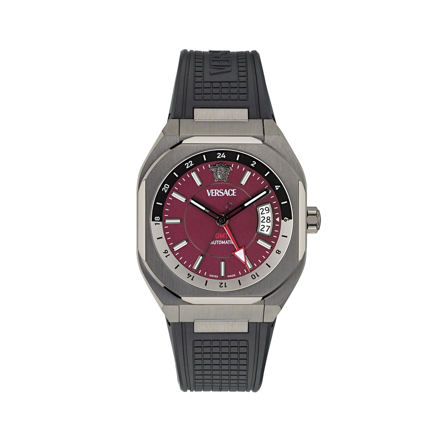Discover the elegance of Versace with this wrist watch, featuring an aubergine dial that adds a touch of sophistication. The analogue display ensures timeless appeal, while the durable rubber strap offers comfort and resilience. This watch is a perfect blend of style and functionality, making it a must-have accessory for any collection. -