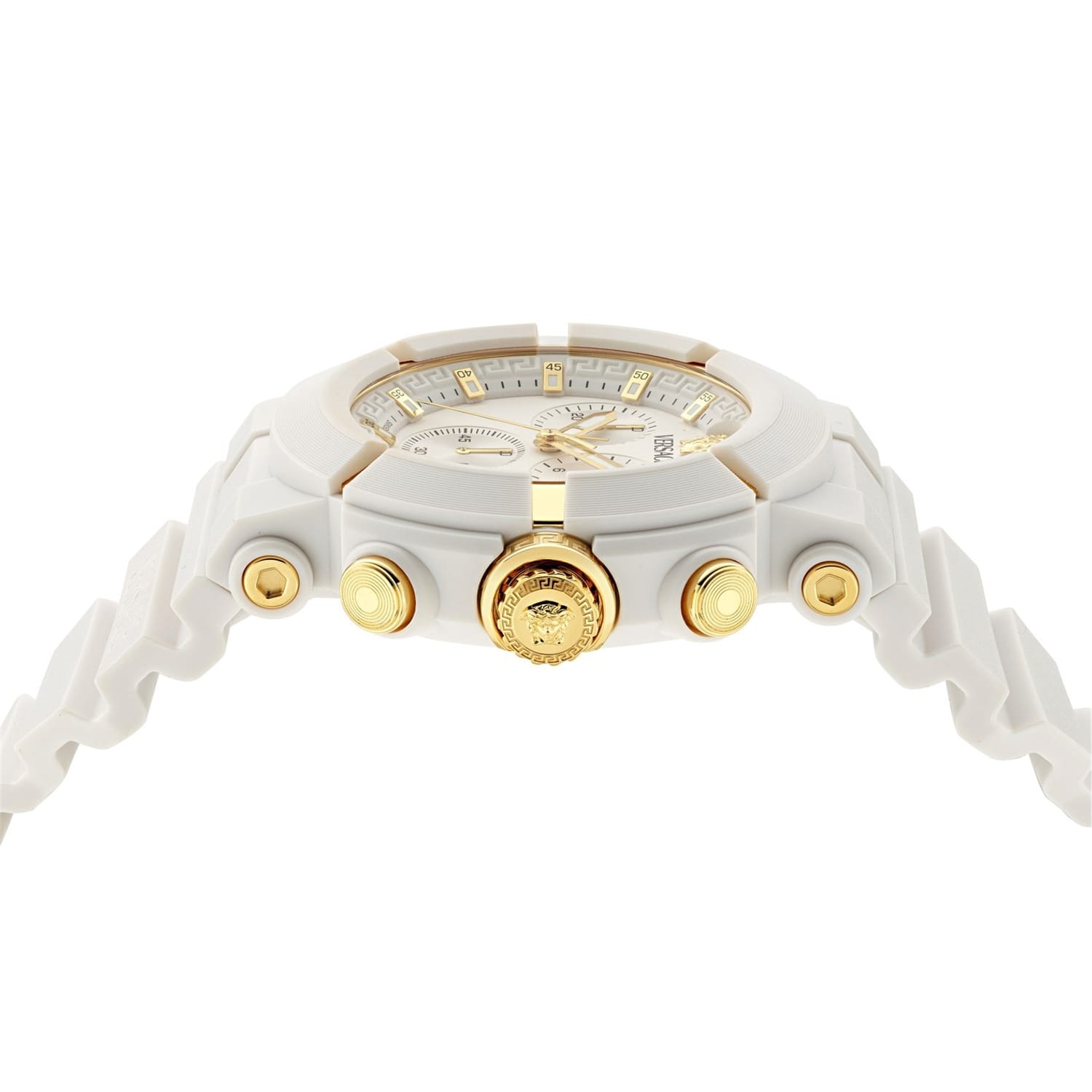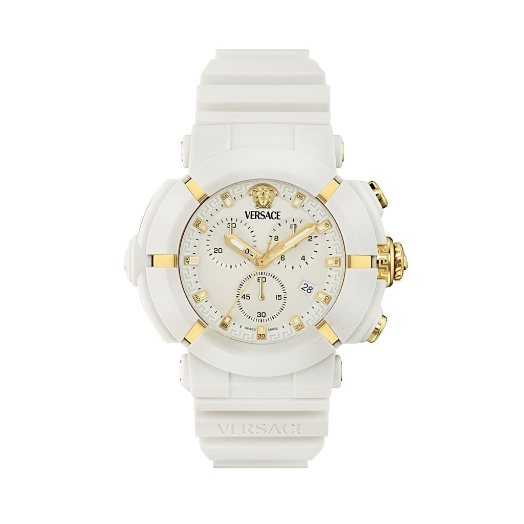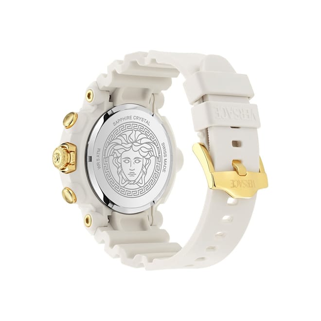 Discover the elegance of Versace with this wrist watch, featuring a classic analogue display. The white dial is complemented by a durable rubber bracelet strap, offering both style and comfort. Water resistant up to 50m, this watch is perfect for casual collections, ensuring reliability and sophistication in every moment. -