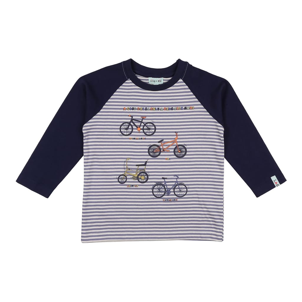 This Lilly & Sid top features a regular fit with long raglan sleeves and a classic crew neck. The design is enhanced by a horizontal stripe pattern, complemented by a distinctive logo graphic embellishment. Perfect for adding a touch of style to any wardrobe. -