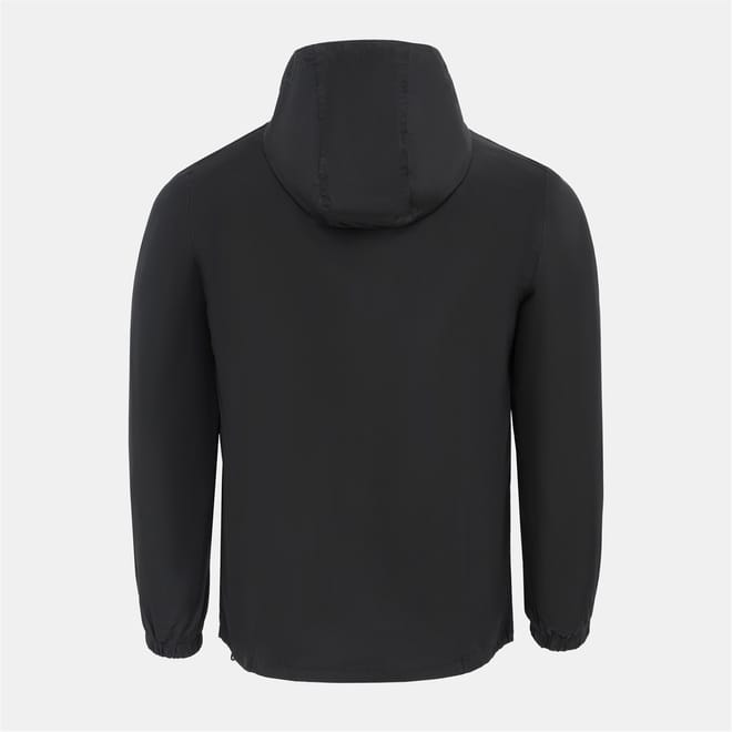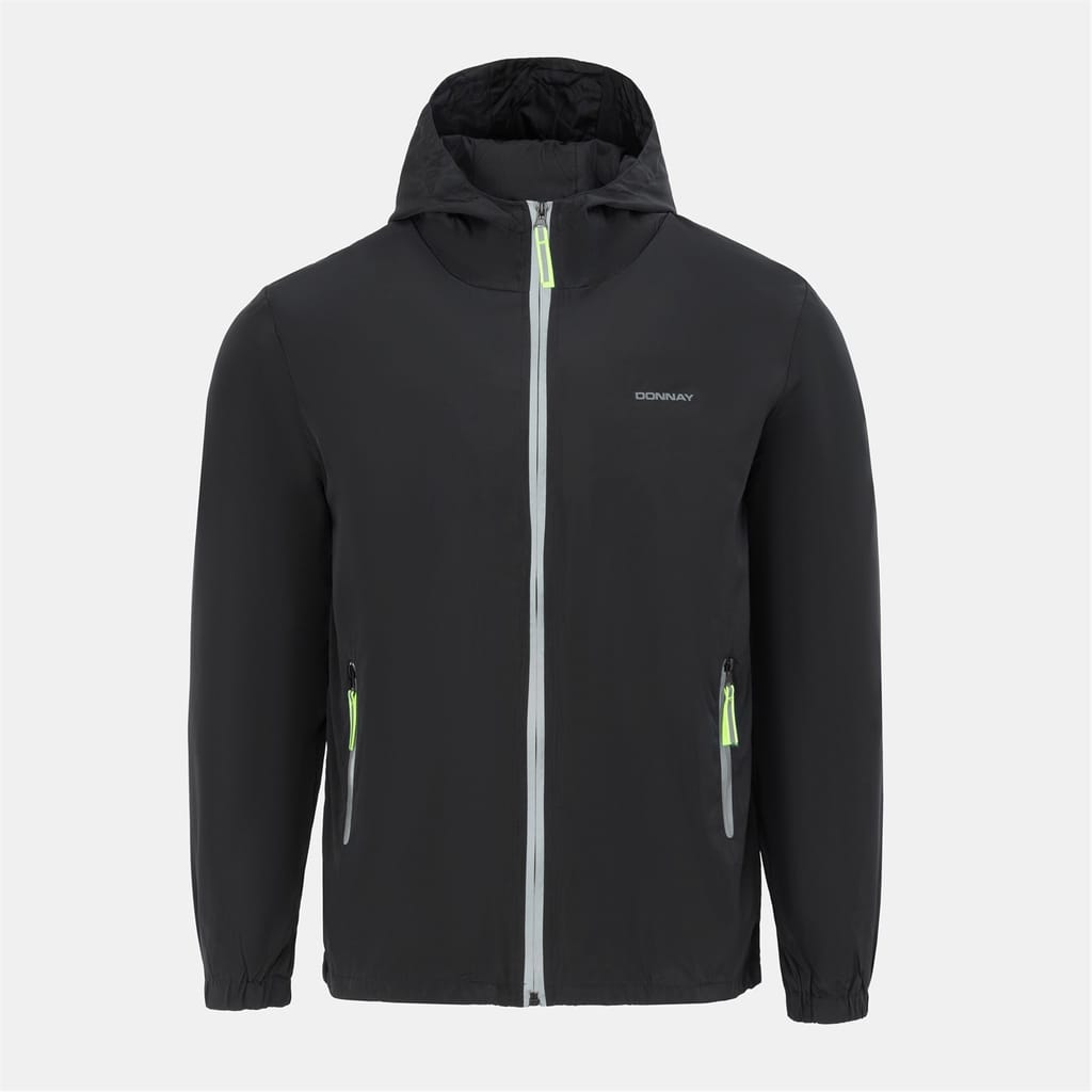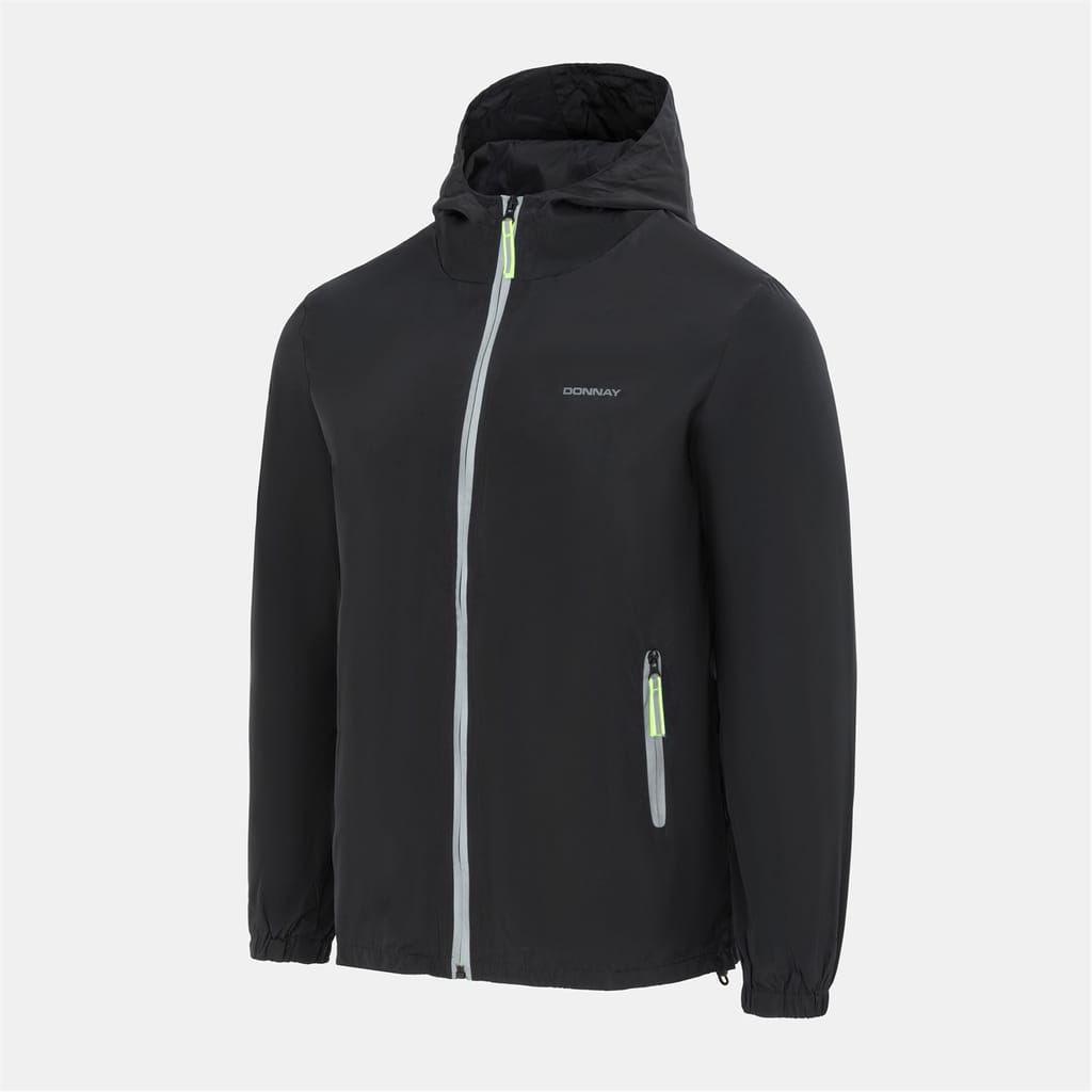 The Donnay windbreaker features a hooded design with a zipper closure, offering a regular fit. It includes elasticated cuffs and hem for added comfort. The solid pattern is complemented by a logo embellishment and practical pockets, making it a versatile choice for various weather conditions. -
