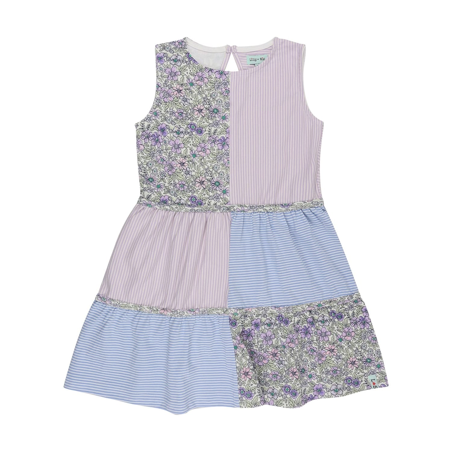 This Lilly & Sid dress features a charming patchwork design, perfect for adding a playful touch to any wardrobe. The knee-length A-line silhouette is complemented by a keyhole neckline, offering a stylish and comfortable fit. The straight hemline adds a neat finish to this delightful piece. -