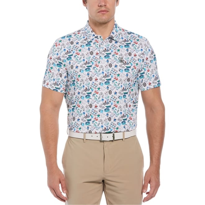 Discover the Original Penguin Golf top, designed for performance with a regular fit. This short-sleeve piece features a polo collar and a button closure, adding a touch of novelty with its unique pattern. The top is embellished with a logo, making it a stylish choice for any golf enthusiast. -
