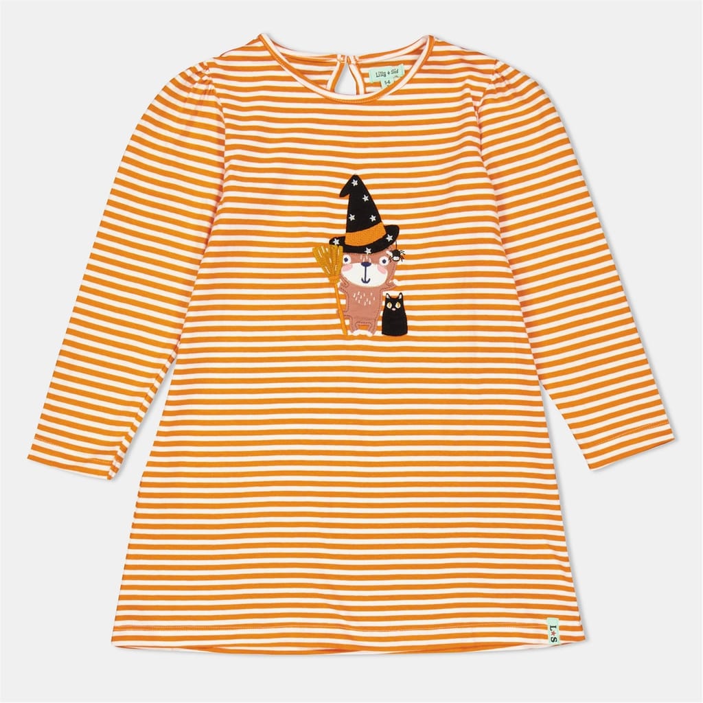 Lilly & Sid mini dress features a charming cat graphic and applique detailing. The A-line silhouette is enhanced by horizontal stripes, offering a playful touch. Designed with a crew neck and straight hem, this regular fit dress is perfect for casual outings. -