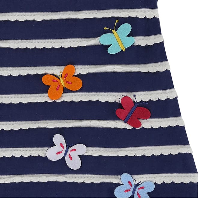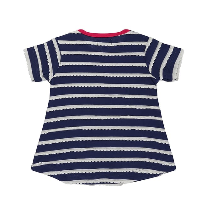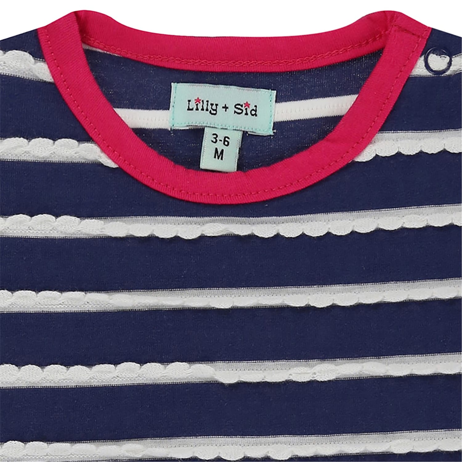 This Lilly & Sid top features a charming stripe pattern and short sleeves. The crew neck design is complemented by an eye-catching applique, adding a playful touch to the overall look. -