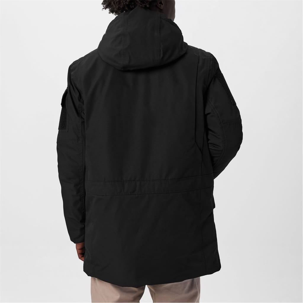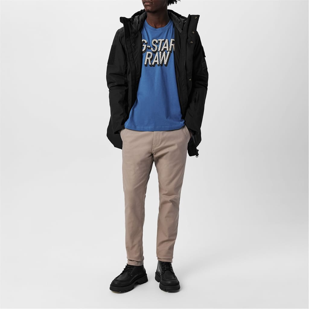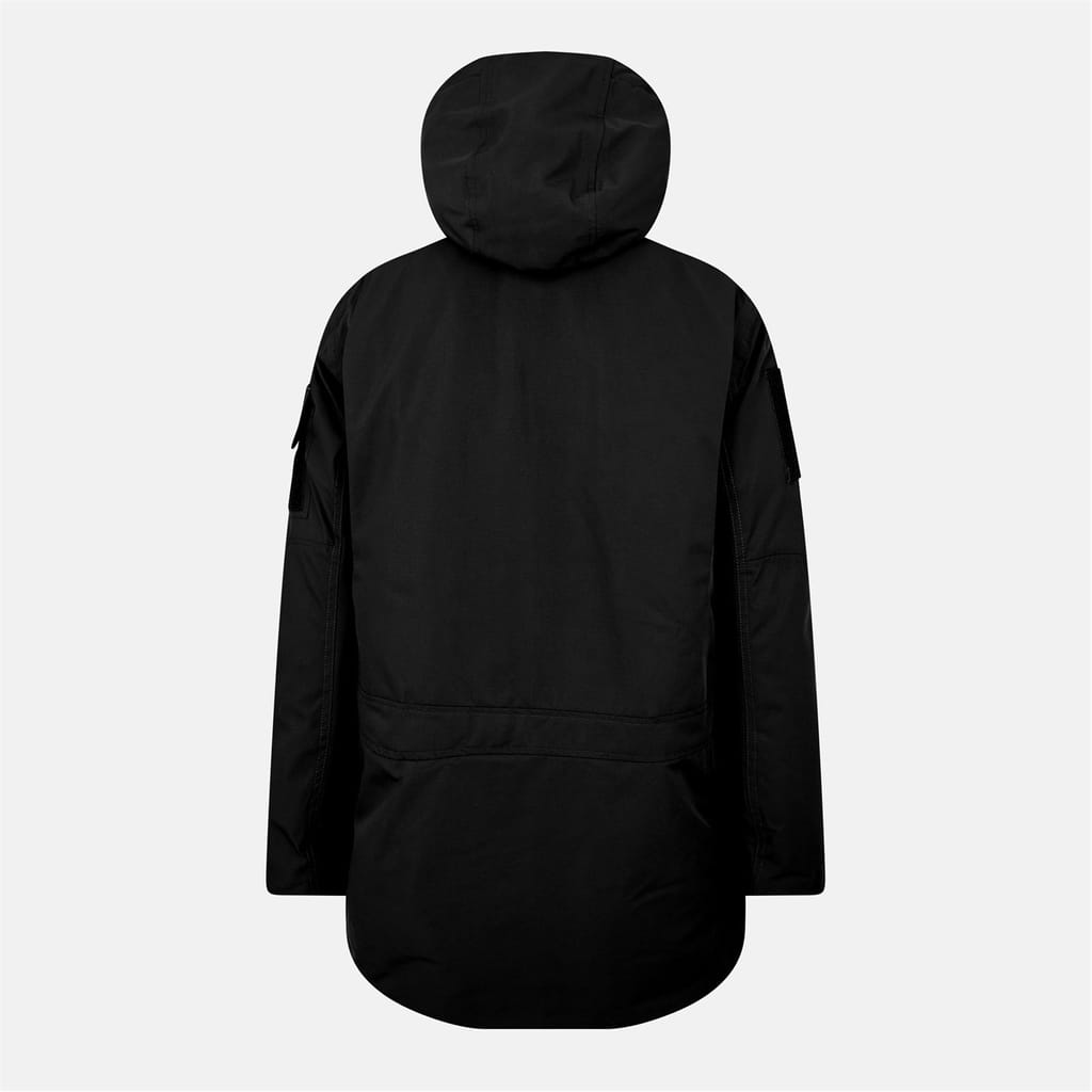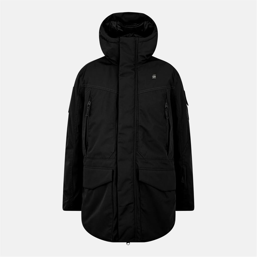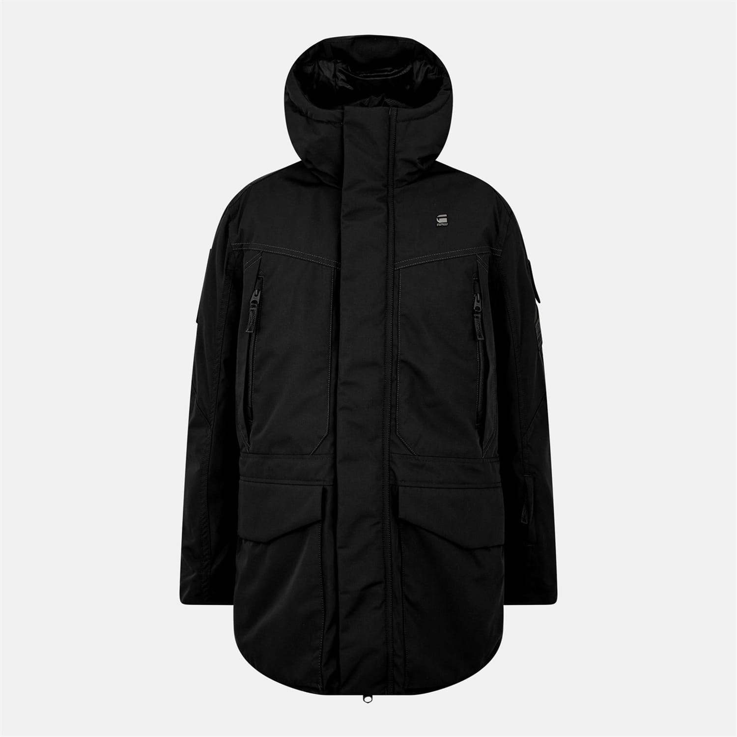 G Star's Expedition Padded Hooded Parka offers a peak hood with a raised front and pull cords for optimum protection. The 2-way zipper is covered by a storm panel with hidden snaps. The cord inside allows for a tighter waist. This padded jacket has pockets at the chest, waist as well as the sleeves. Inner pockets complete it.