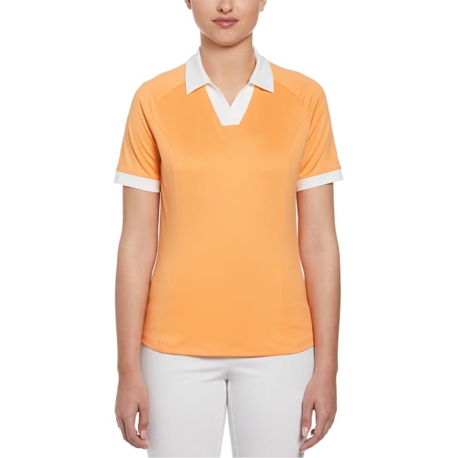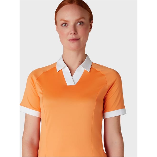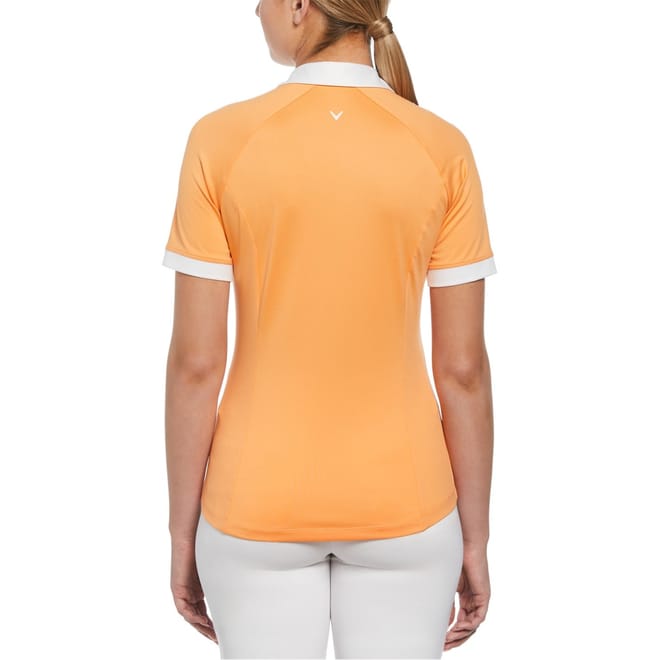 This Callaway top is a perfect blend of performance and style, ideal for semi-formal occasions. Featuring a polo collar and raglan short sleeves, it offers a regular fit for comfort. The solid pattern is complemented by a subtle logo embellishment, adding a touch of sophistication to this versatile piece. -