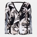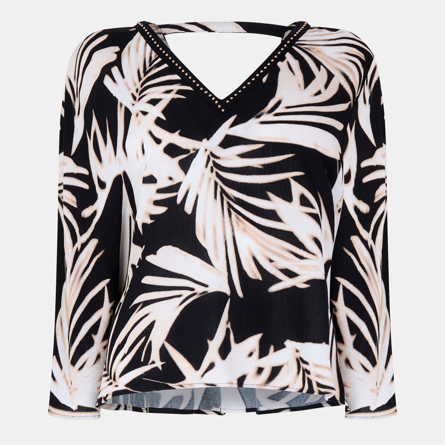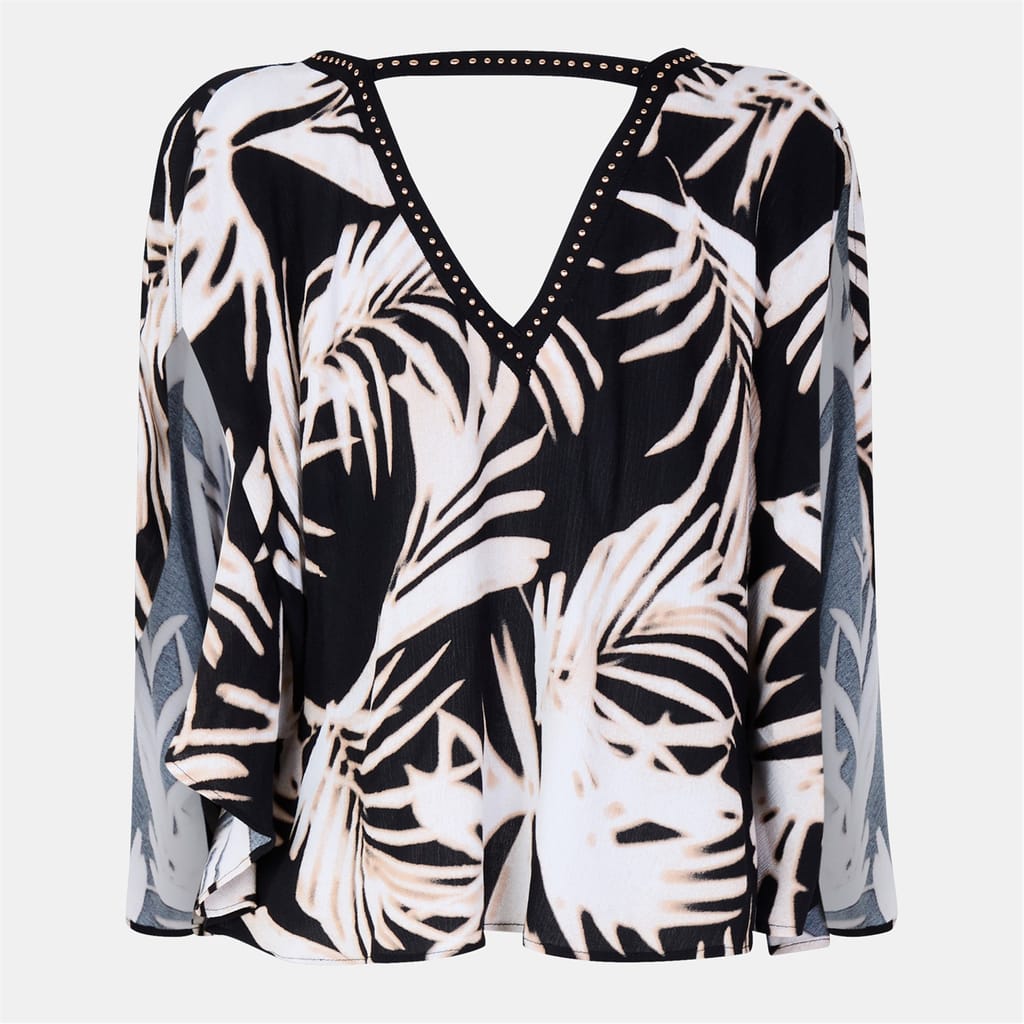 This Biba top features a relaxed fit with long sleeves and a stylish V-neck. Adorned with a leaf print, it is further enhanced by stud and trim embellishments, adding a touch of elegance to your wardrobe. -