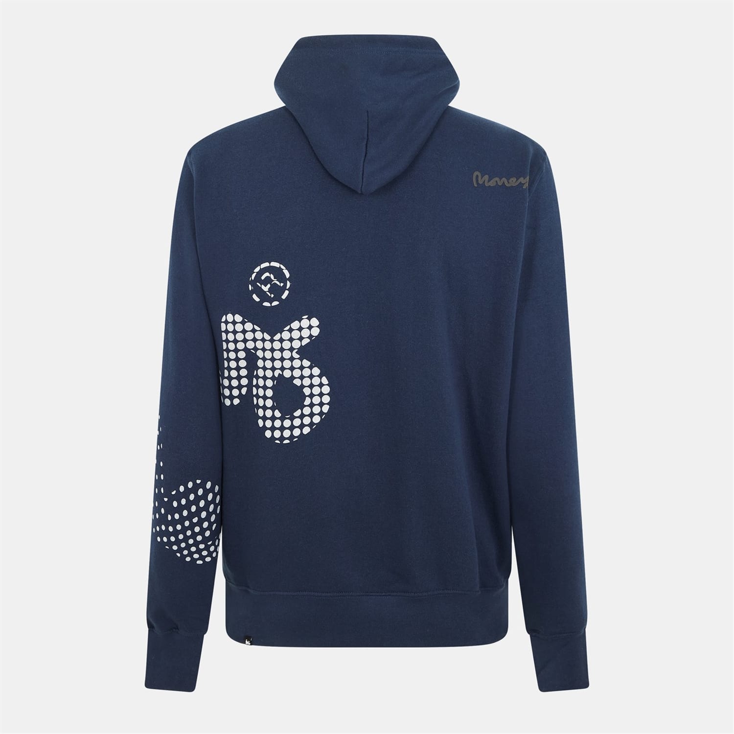 This Money top features a hooded neck and long sleeves with ribbed cuffs, offering a regular fit. The design includes a drawstring closure and a kangaroo pocket for added functionality. Adorned with a polka dot pattern and graphic embellishments, this top combines style and practicality. -